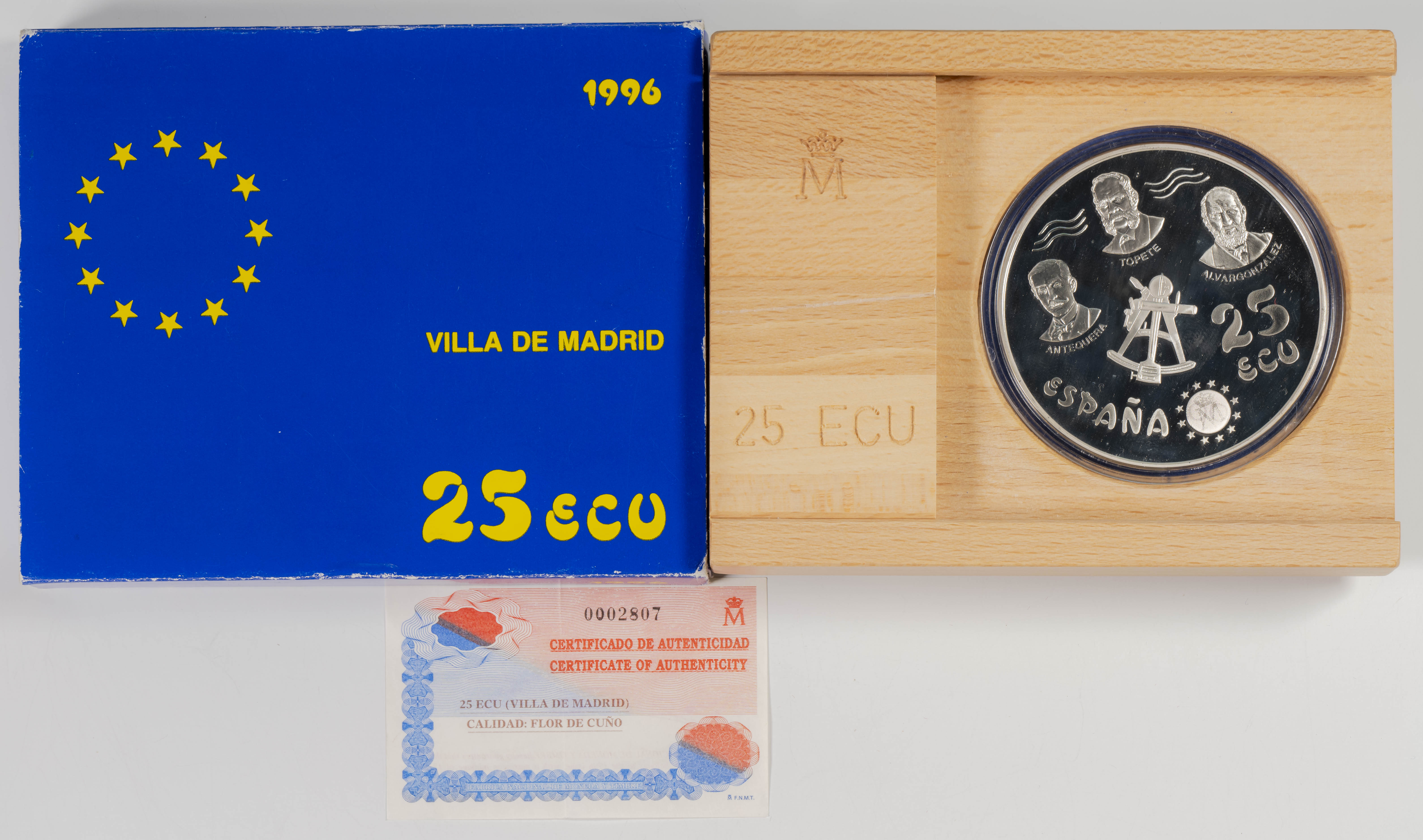 JUAN CARLOS I (1975-2014). 25 Ecu. (Ar. 168,75g/73mm). 1996. FNMT. Serie de la Marina Española. Villa de Madrid. FDC. Incluye estuche original y certificado de autenticidad.