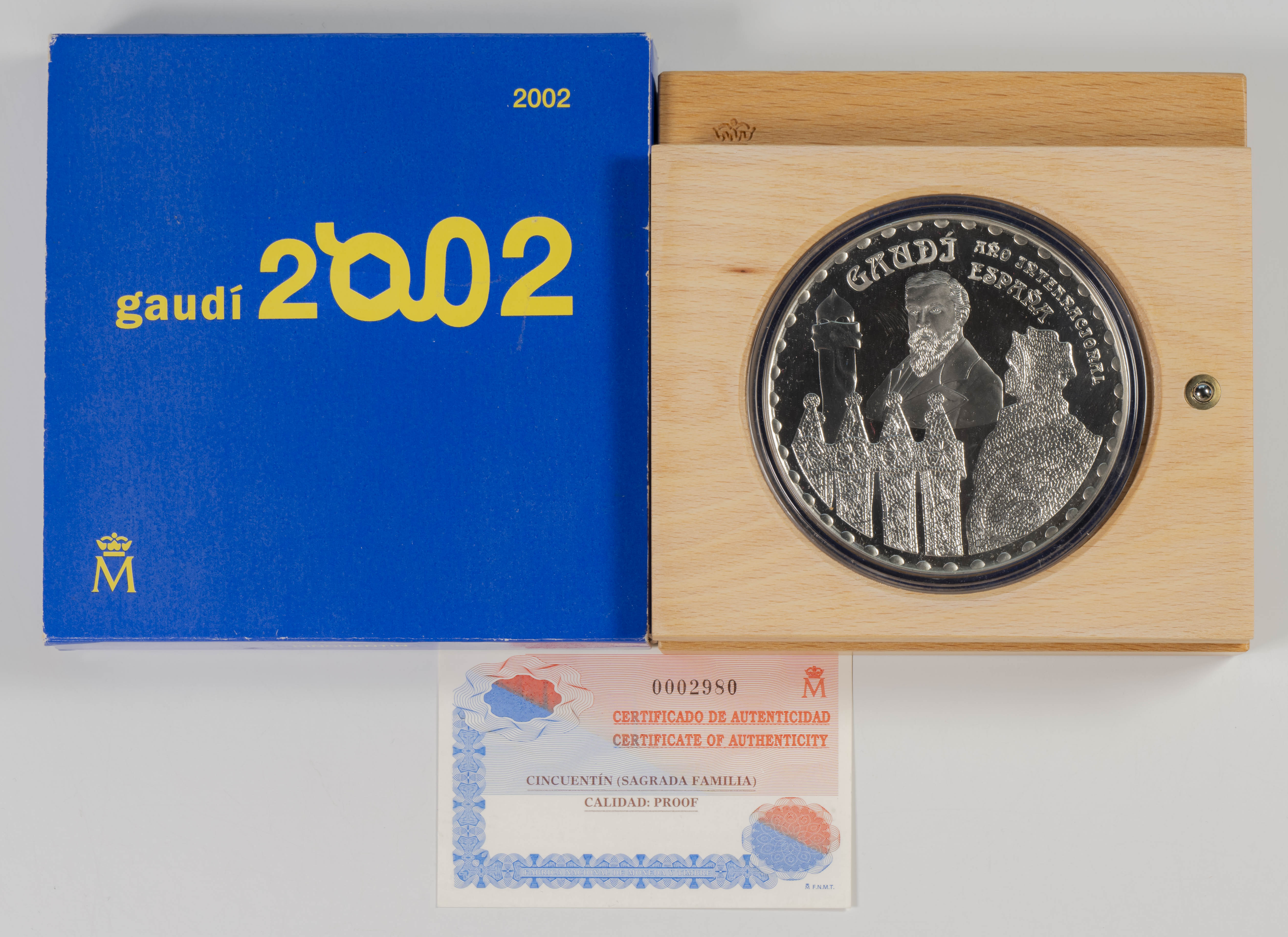 JUAN CARLOS I (1975-2014). 50 Euros. (Ar. 168,75g/73mm). Gaudí. Sagrada Familia. 2002. FNMT. PROOF. Incluye estuche completo y certificado de autenticidad. Sólo 5000 unidades.