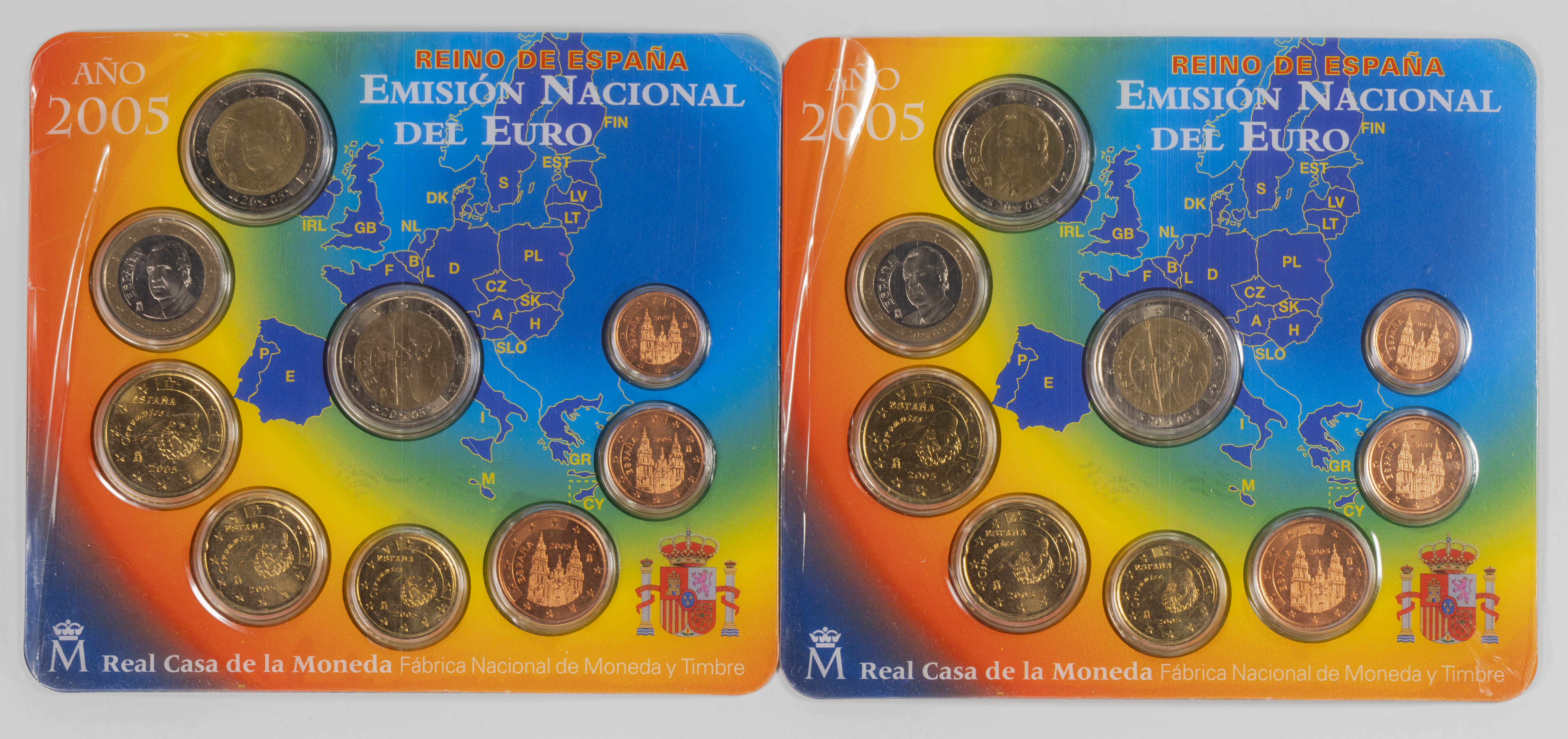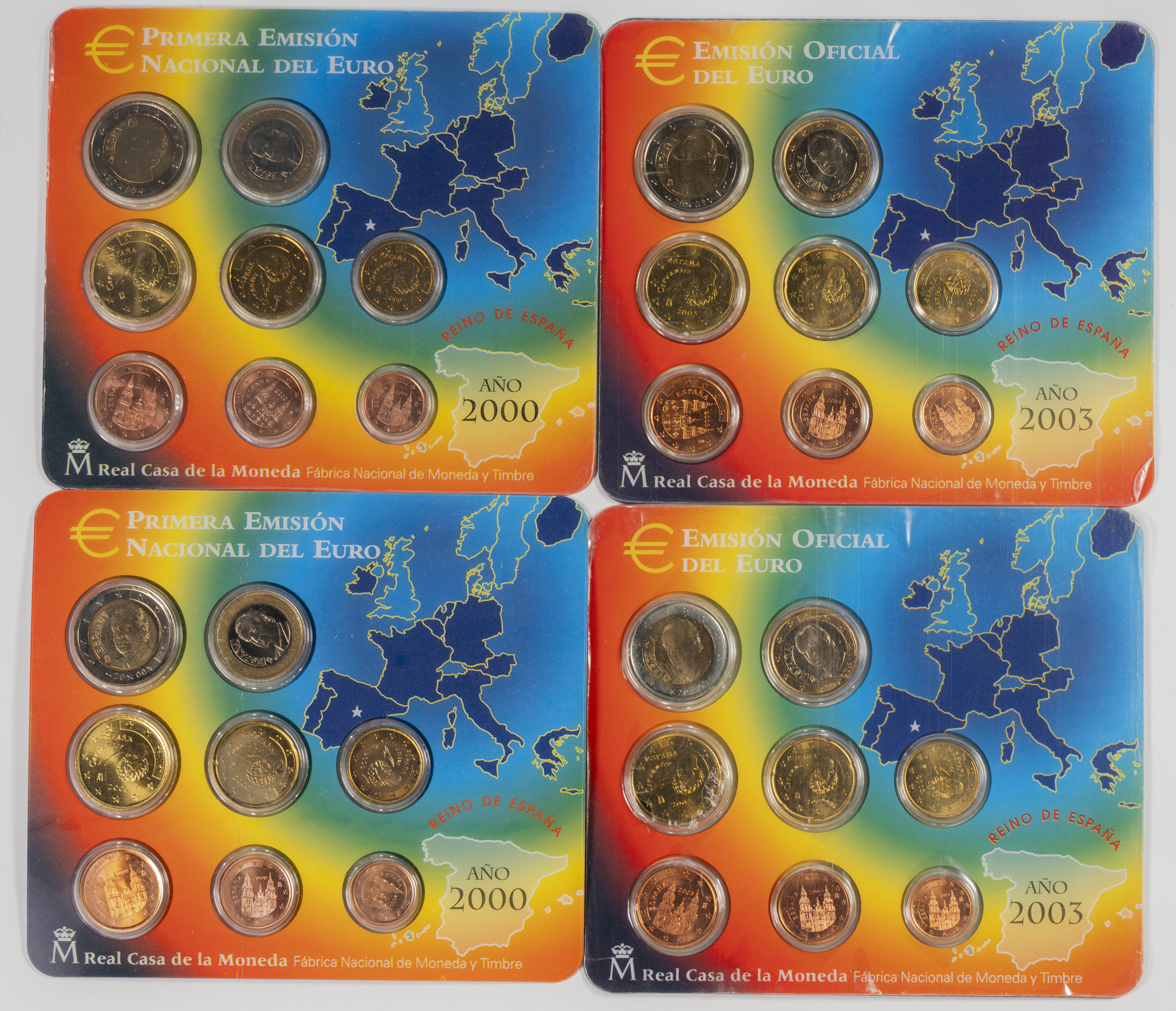 JUAN CARLOS I (1975-2014). Conjunto de 6 blisters completos correspondientes a la primera emisión del euro, año 2002 y las emisiones de 2003 y 2005. A EXAMINAR.