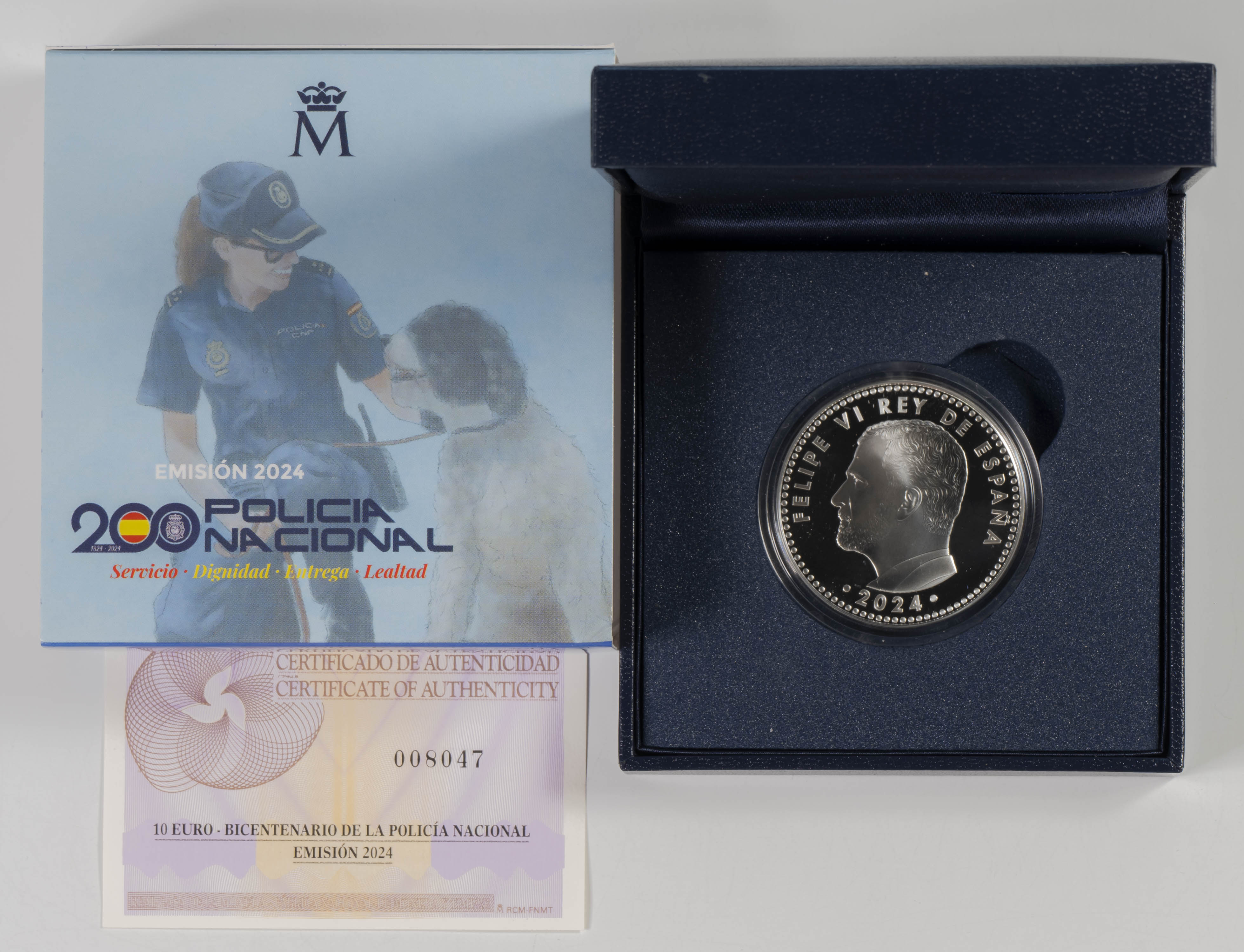 FELIPE VI (2014-?). 10 Euros. (Ar. 27,00g/40mm). Bicentenario de la creación de la Policía Nacional. 2024. FNMT. PROOF. Incluye estuche completo y certificado de autenticidad. Tirada de sólo 15.000 unidades.