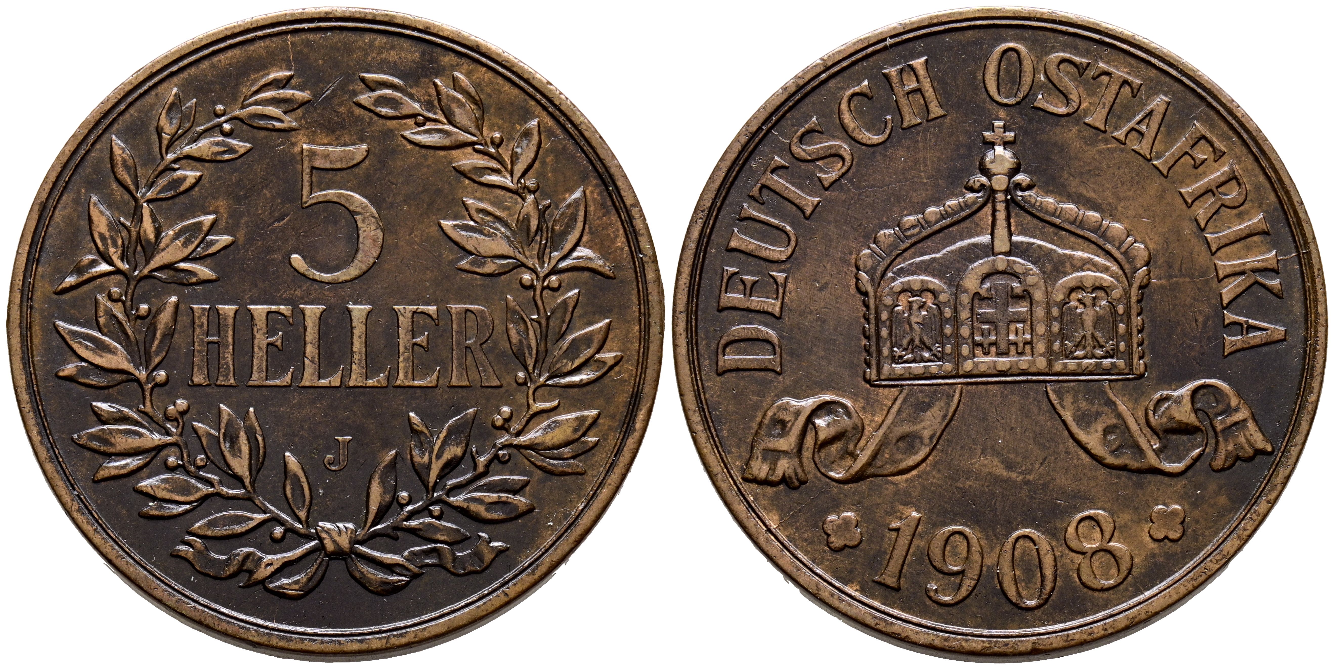 ÁFRICA ORIENTAL ALEMANA. 5 Heller (Ar. 19,99g/37mm). 1908. Guillermo II (1888-1918). Hamburgo J. (Km#11). MBC+.