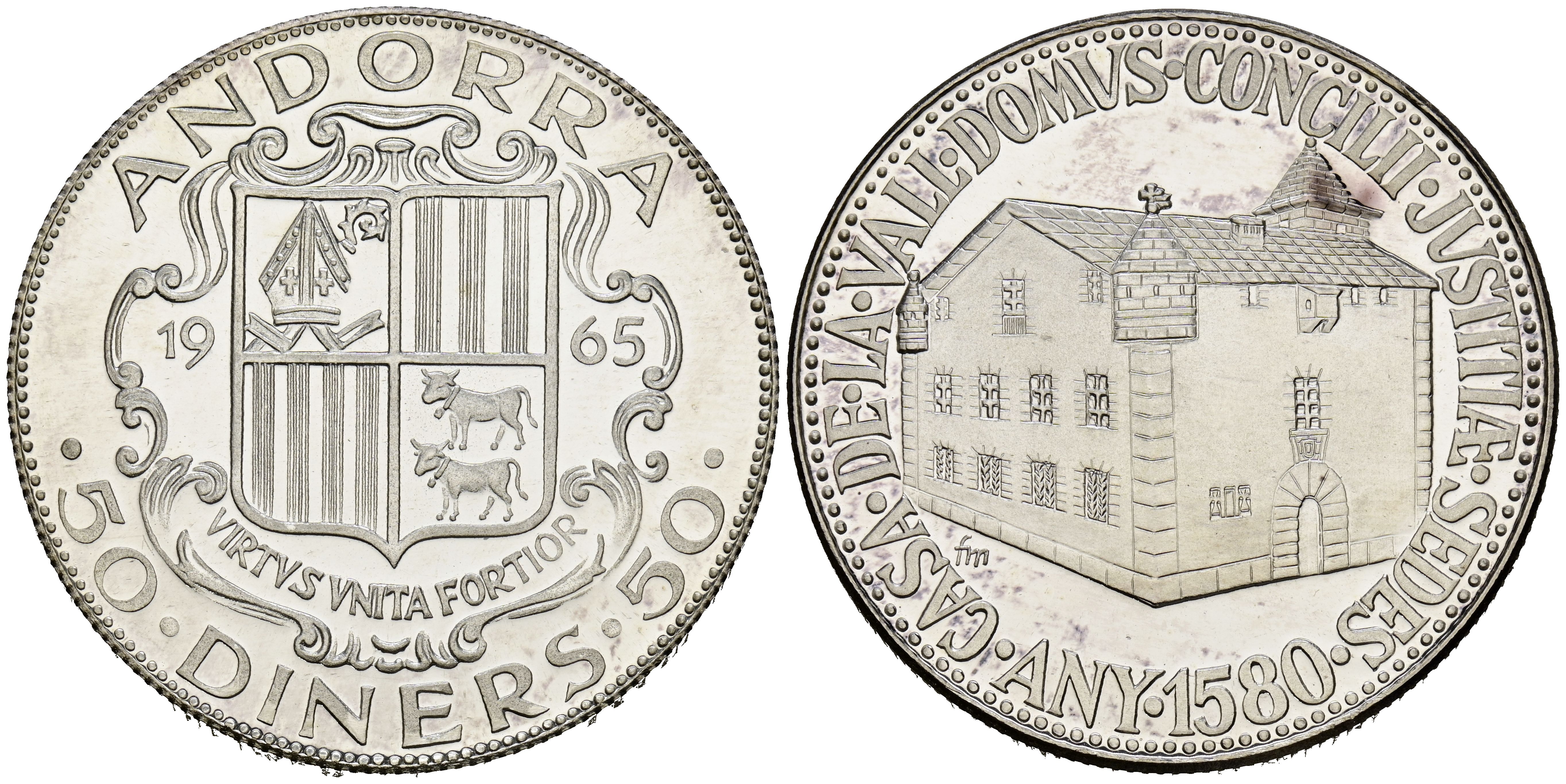 ANDORRA. 50 Diners. (Ar. 27,31g/38mm). 1965. Casa de la Vall. (Km#X12). PROOF. Escasa.