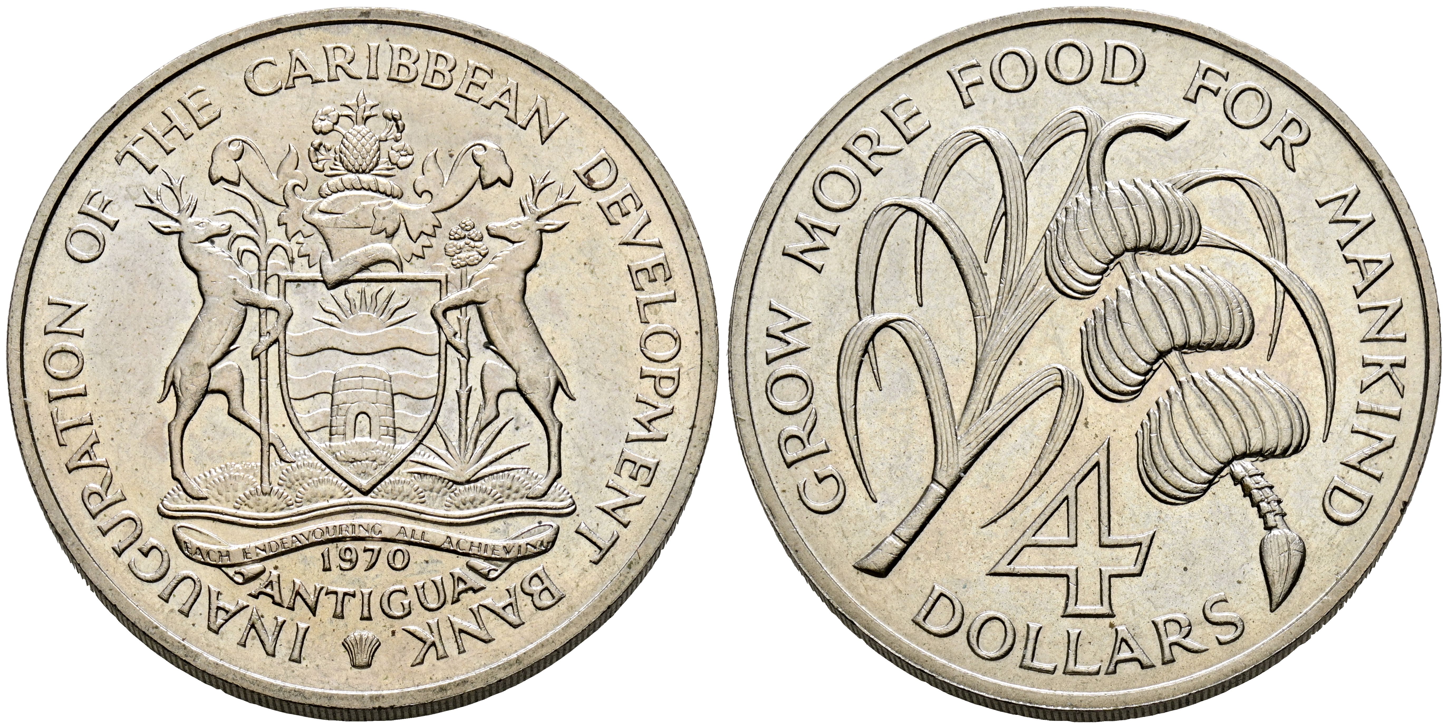 ANTIGUA Y BARBUDA. 4 Dollars (Ae-Ni. 28,06g/39mm). 1970. FAO. (Km#1). EBC+. Tirada de sólo 14.000 piezas.