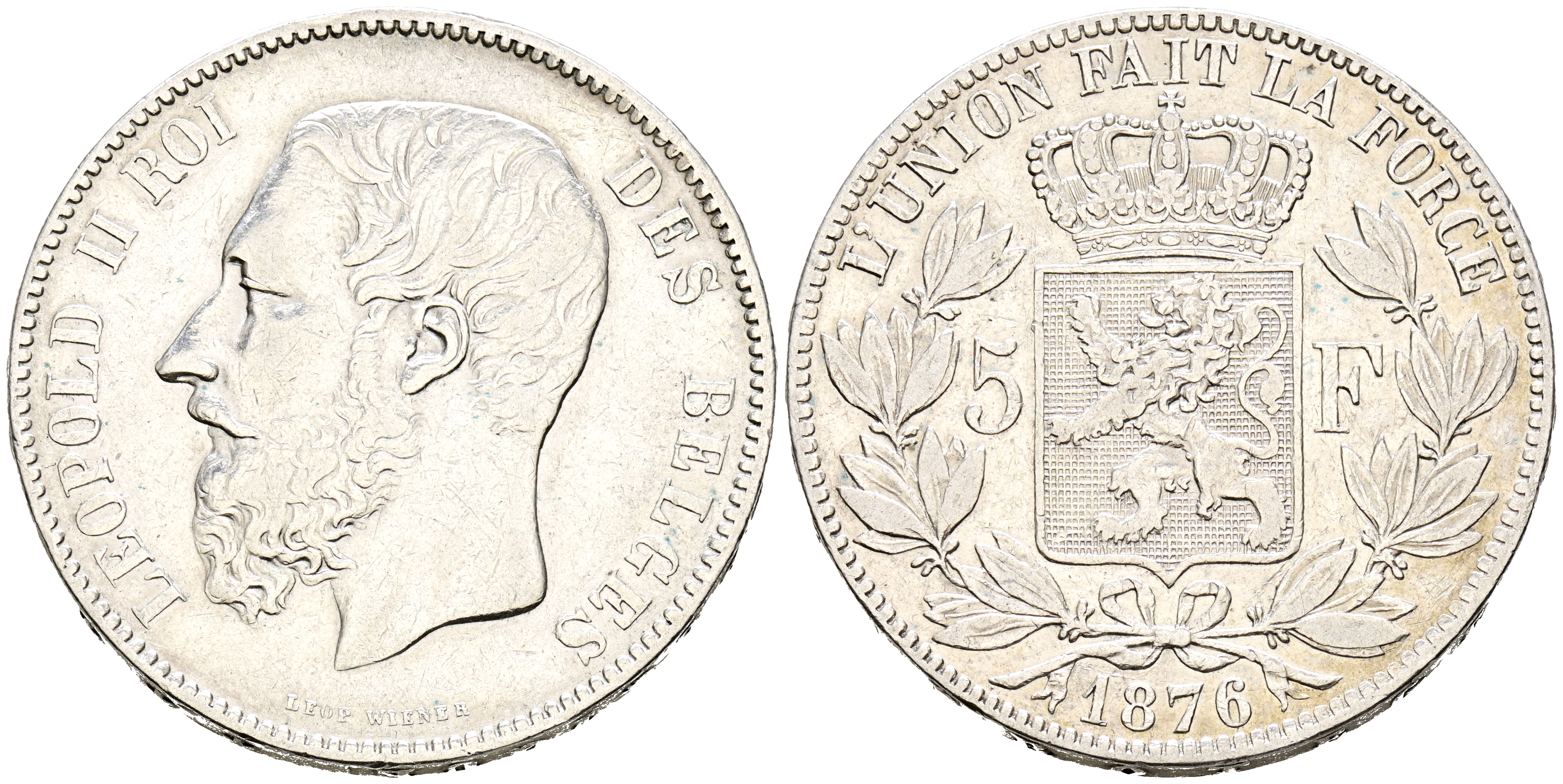 BÉLGICA, Leopoldo II. 5 Francos. (Ar. 24,87g/37mm). 1876. (Km#24). MBC.
