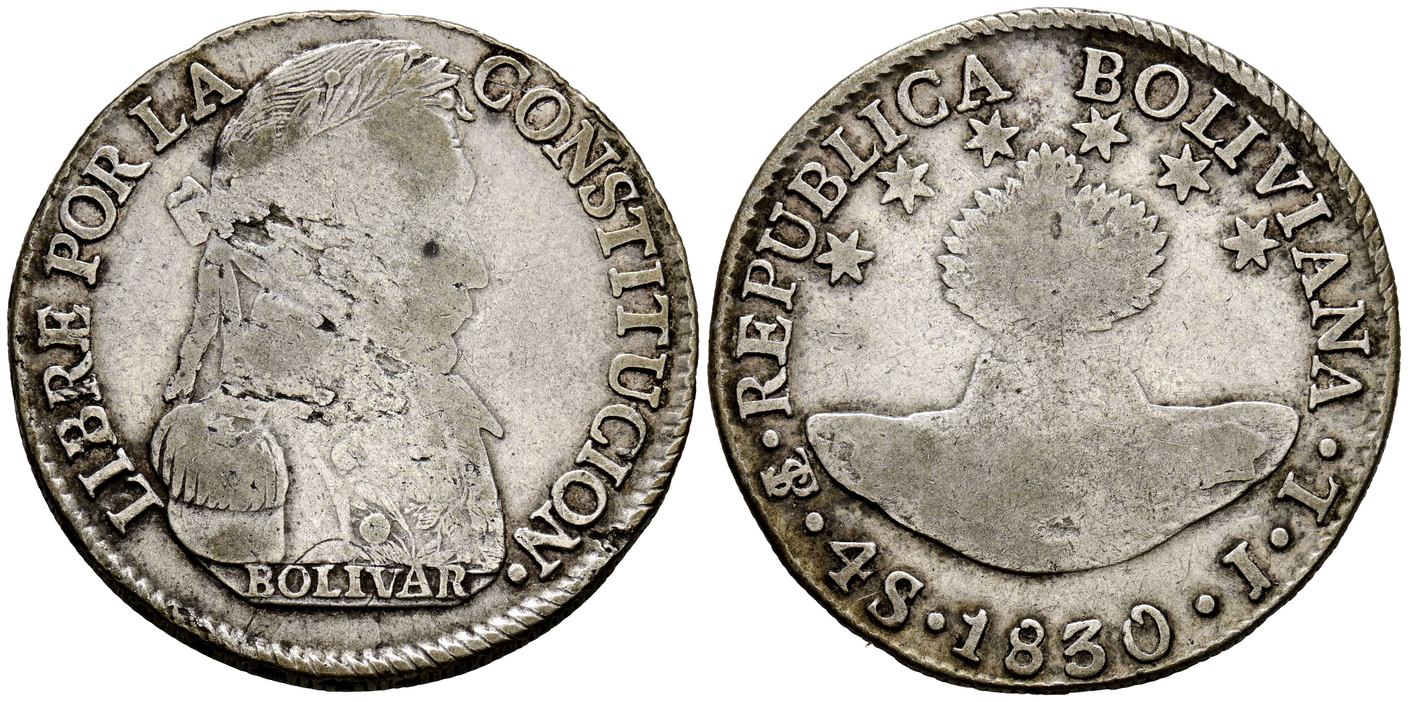 BOLIVIA. 4 Soles (Ar. 13,37g/32mm). 1830. Potosí JL. (Km#96a). BC+/MBC-.