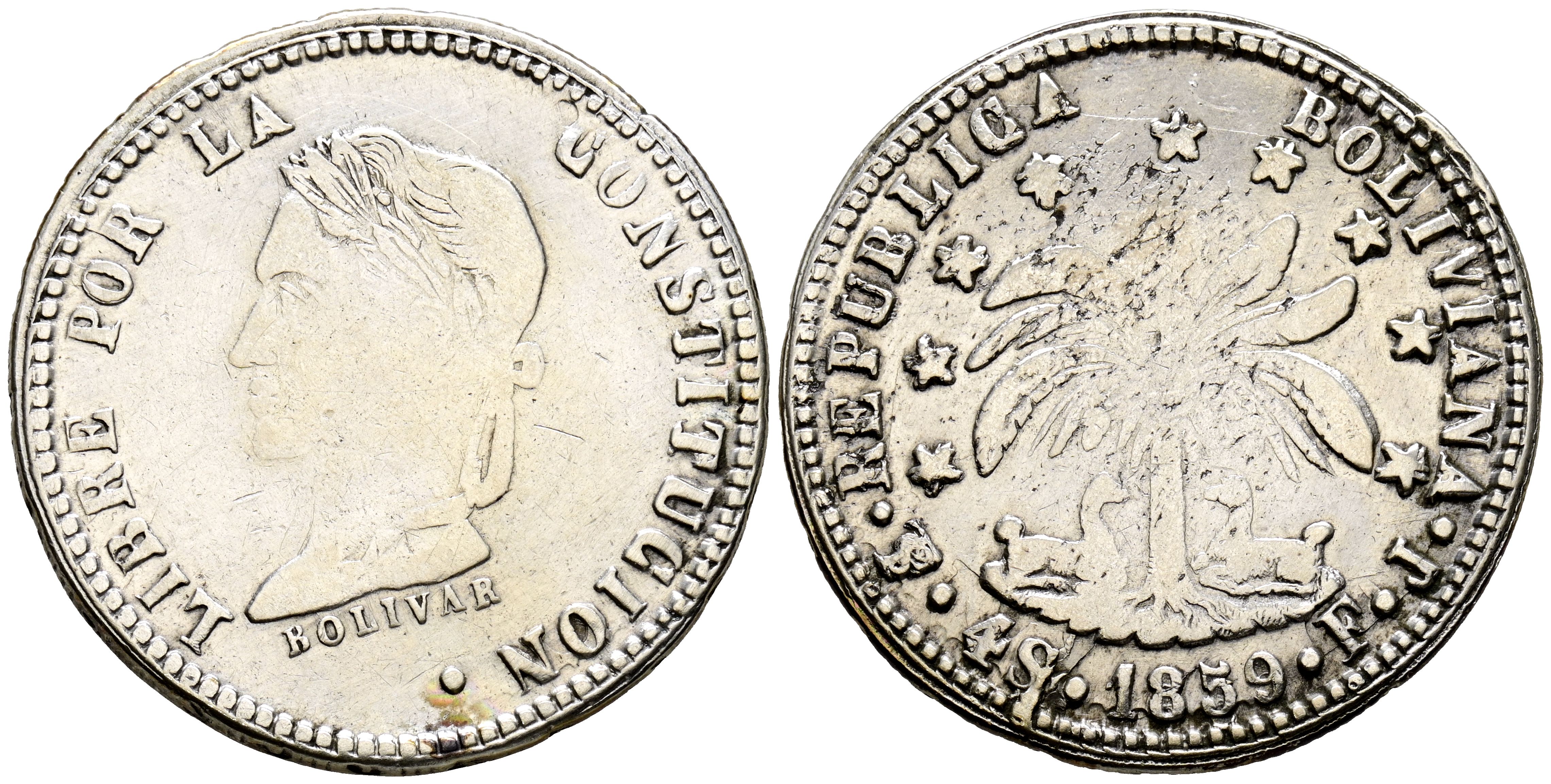 BOLIVIA. 4 Soles (Ar. 13,48g/32mm). 1859. Potosí FJ. (Km#123.3). MBC-.