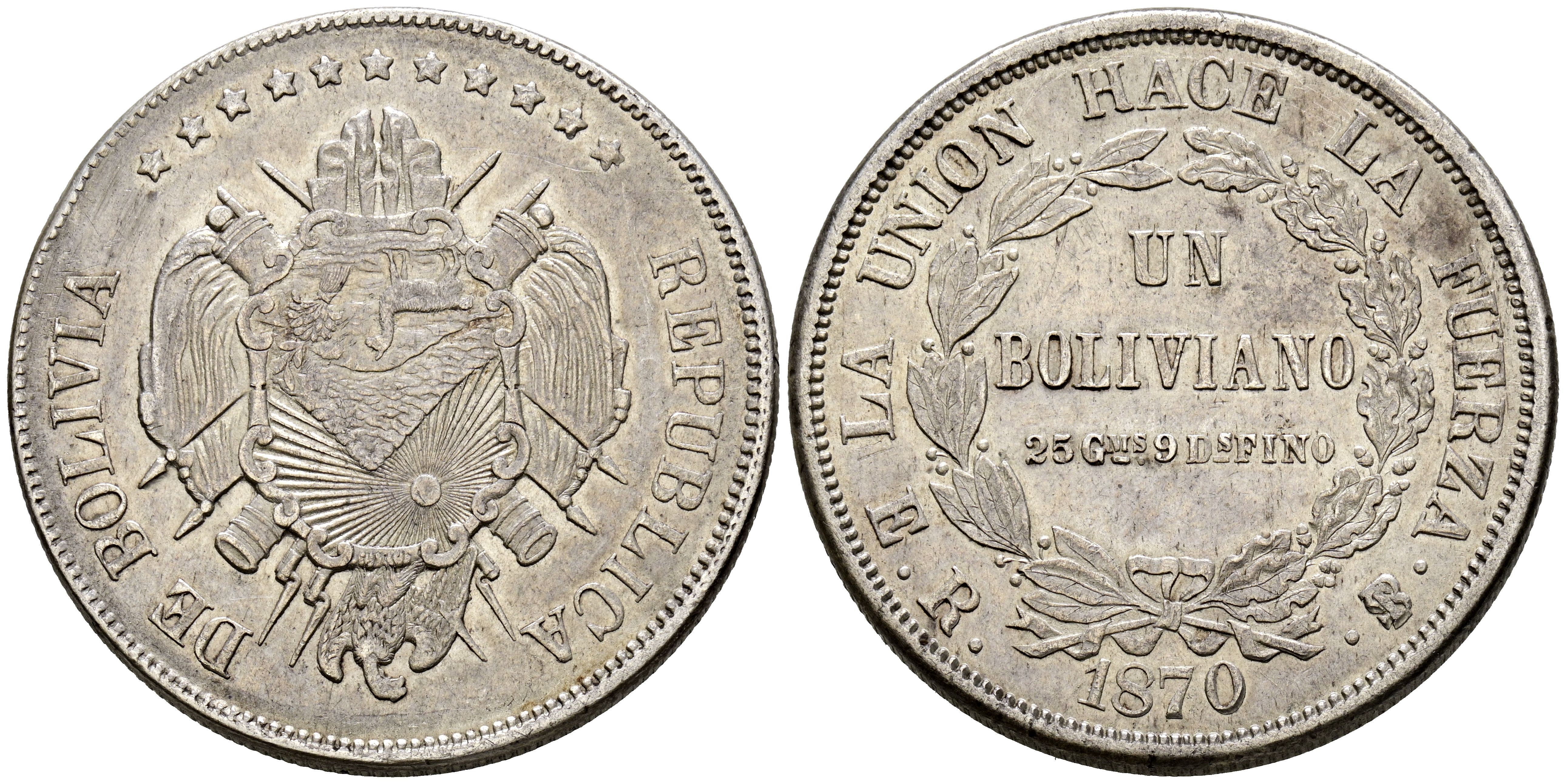 BOLIVIA. 1 Boliviano (Ar. 24,93g/37mm). 1870. Potosí ER. (Km#155.3). Línea y no punto debajo de MS. MBC+.