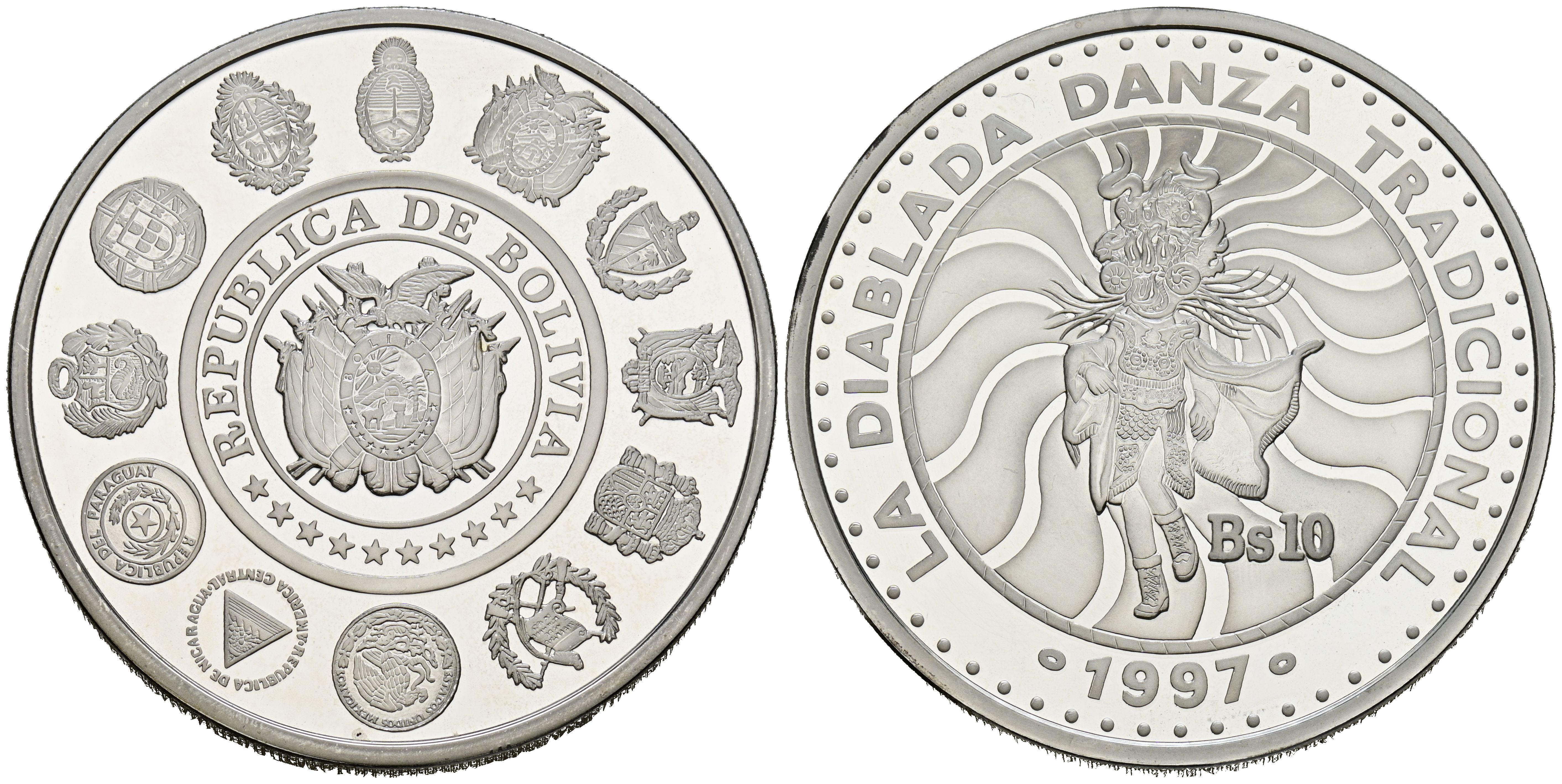 BOLIVIA. 10 Bolivianos (Ar. 27,08g/39mm). 1997. Serie Iberoamericana. La diablada. (Km#209). PROOF.