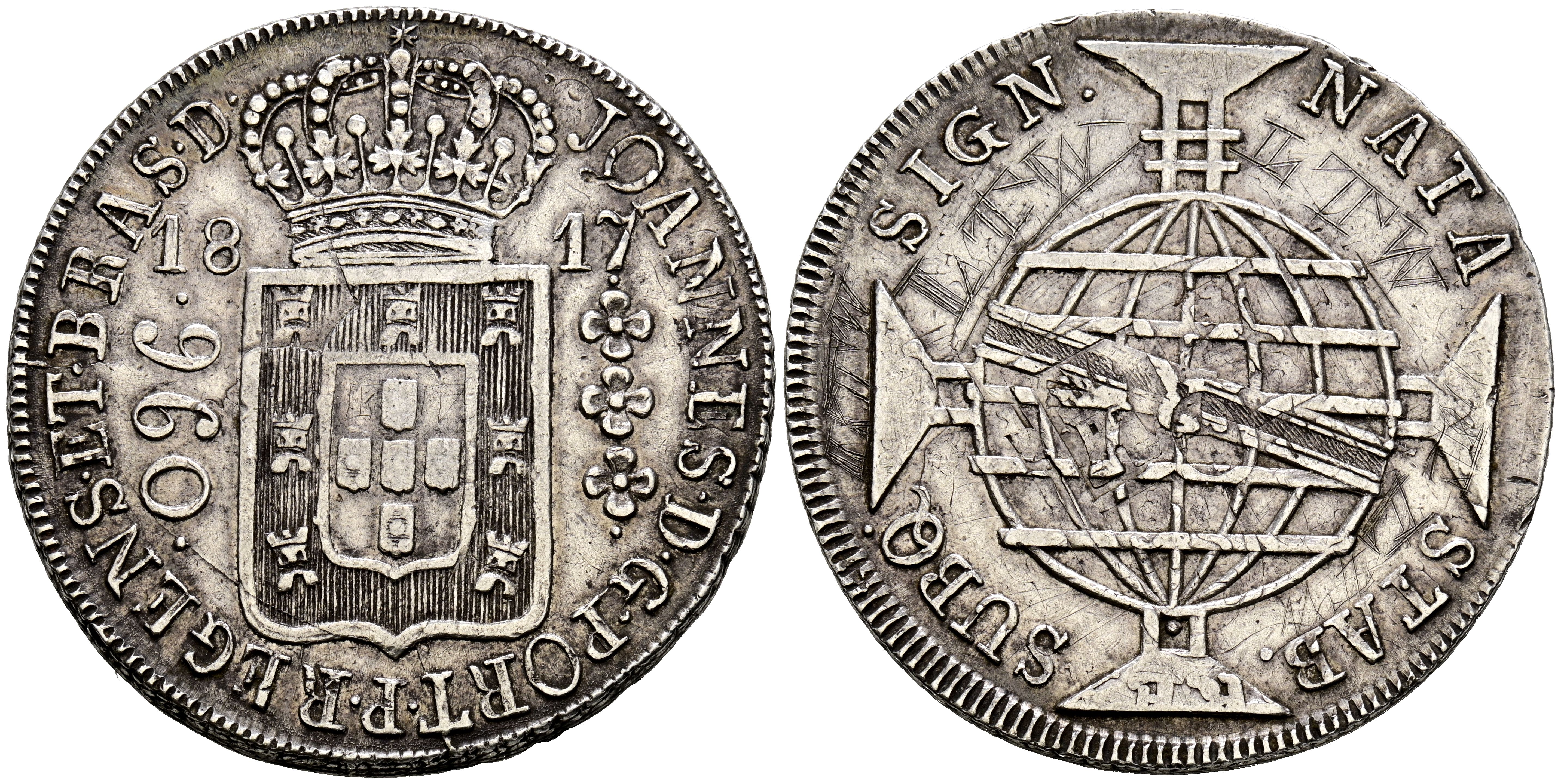 BRASIL (Portugués), Joao Príncipe Regente. 960 Reis. (Ar. 26,83g/41mm). 1817. Río R. (Km#307.3). Acuñada sobre una moneda de 8 Reales de Carlos IV acuñado en 1800. MBC+. Bonito tono. La pieza presenta en varios puntos del reverso inciales a punzón que podrían ser del coleccionista.
