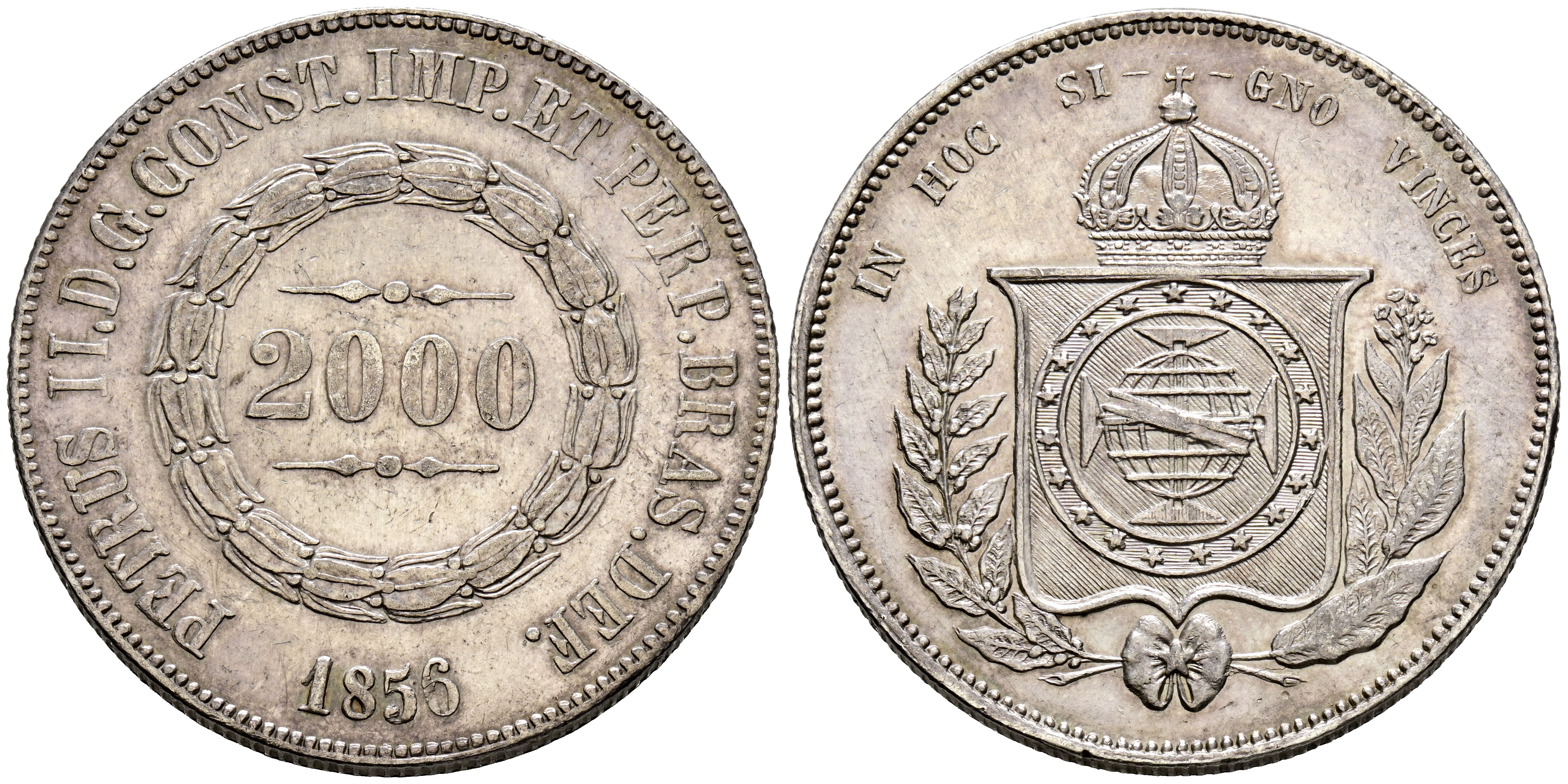 BRASIL, Pedro II. 2000 Reis. (Ar. 25,40g/37mm). 1856. (Km#466). MBC+. Bonito tono.