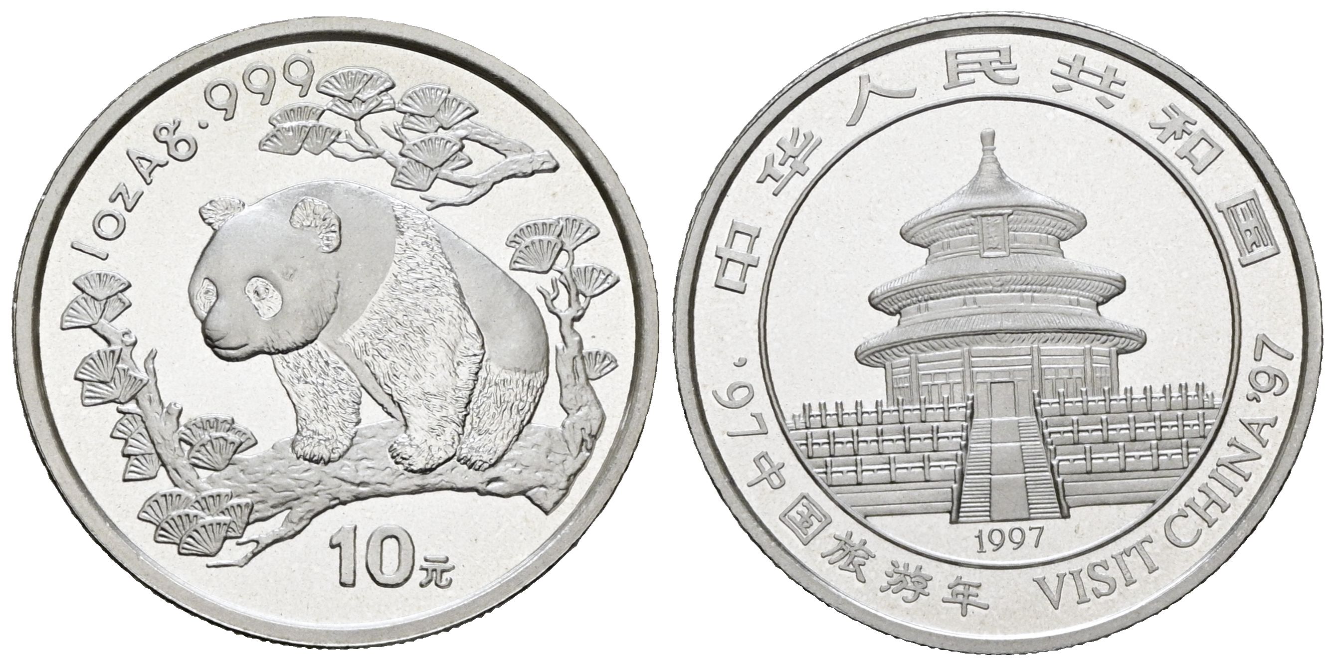 CHINA. 10 Yuan. (Ar. 31,22g/40mm)*. 1997. Serie Panda. Visit China 97 (Año del Turismo). PROOF. Encapsulada y en blister. Tirada de 50.000 unidades.