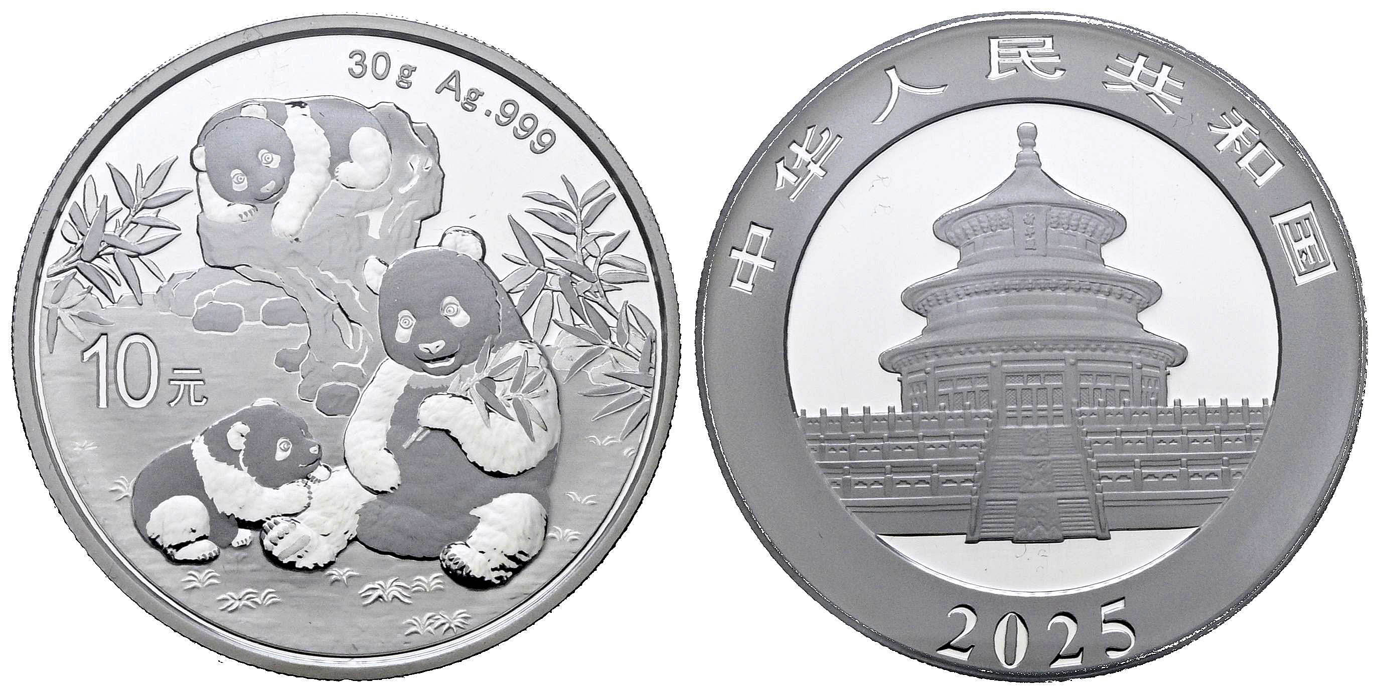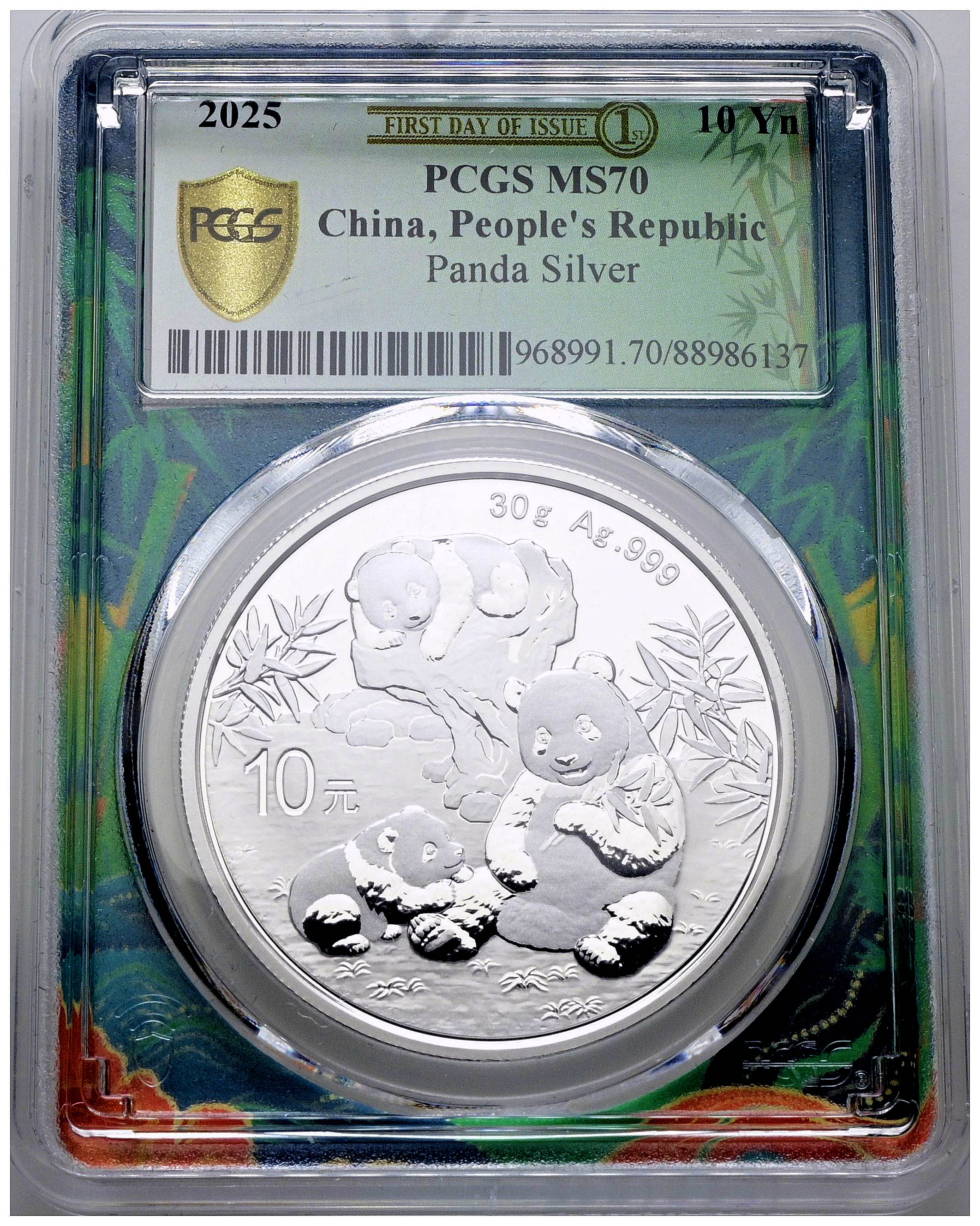 CHINA. 10 Yuan. (Ar. 30,00g/40mm)*. 2025. Serie Panda. Encapsulado por PCGS MS 70, First Day of Issue. *Peso y medidas teóricos.