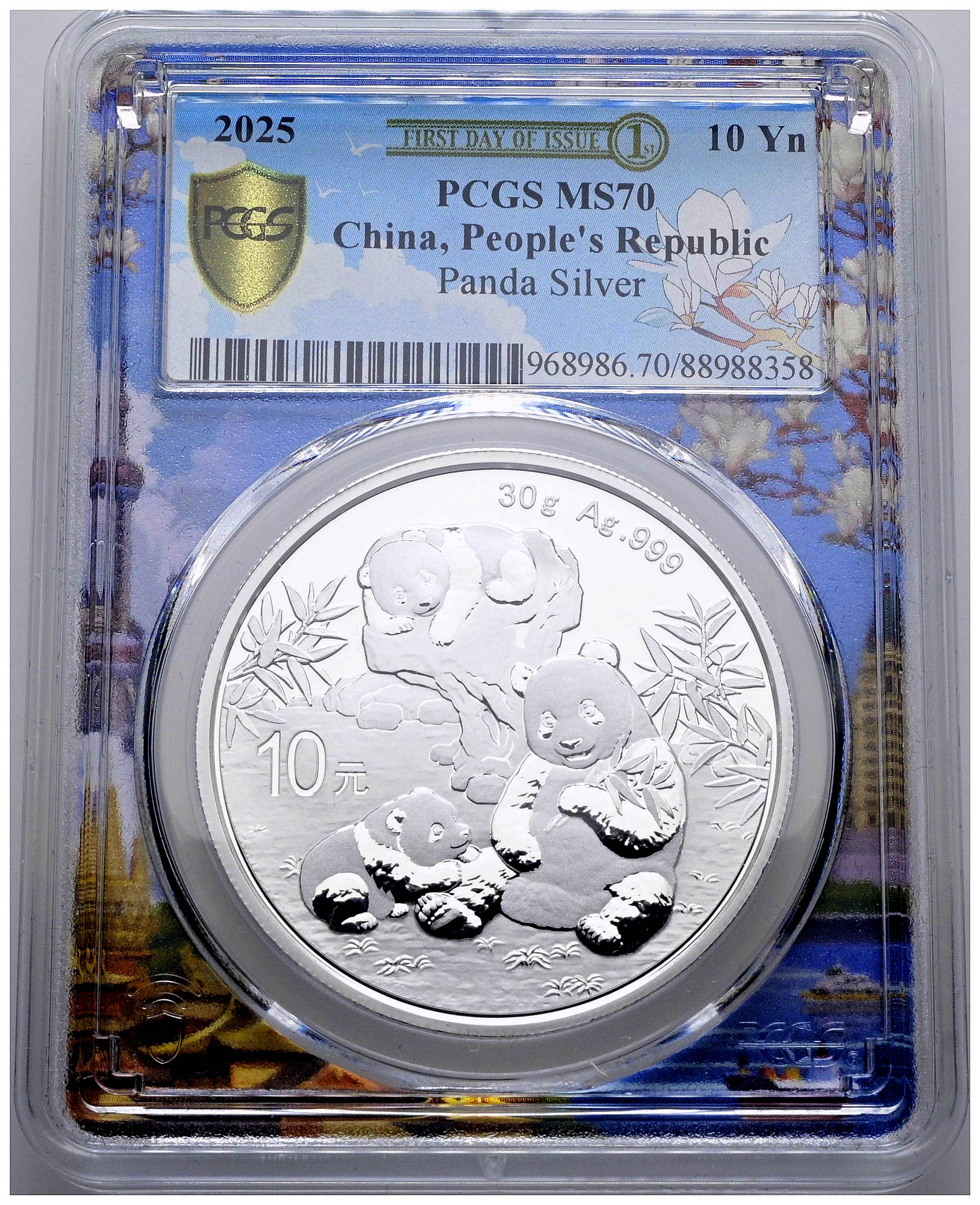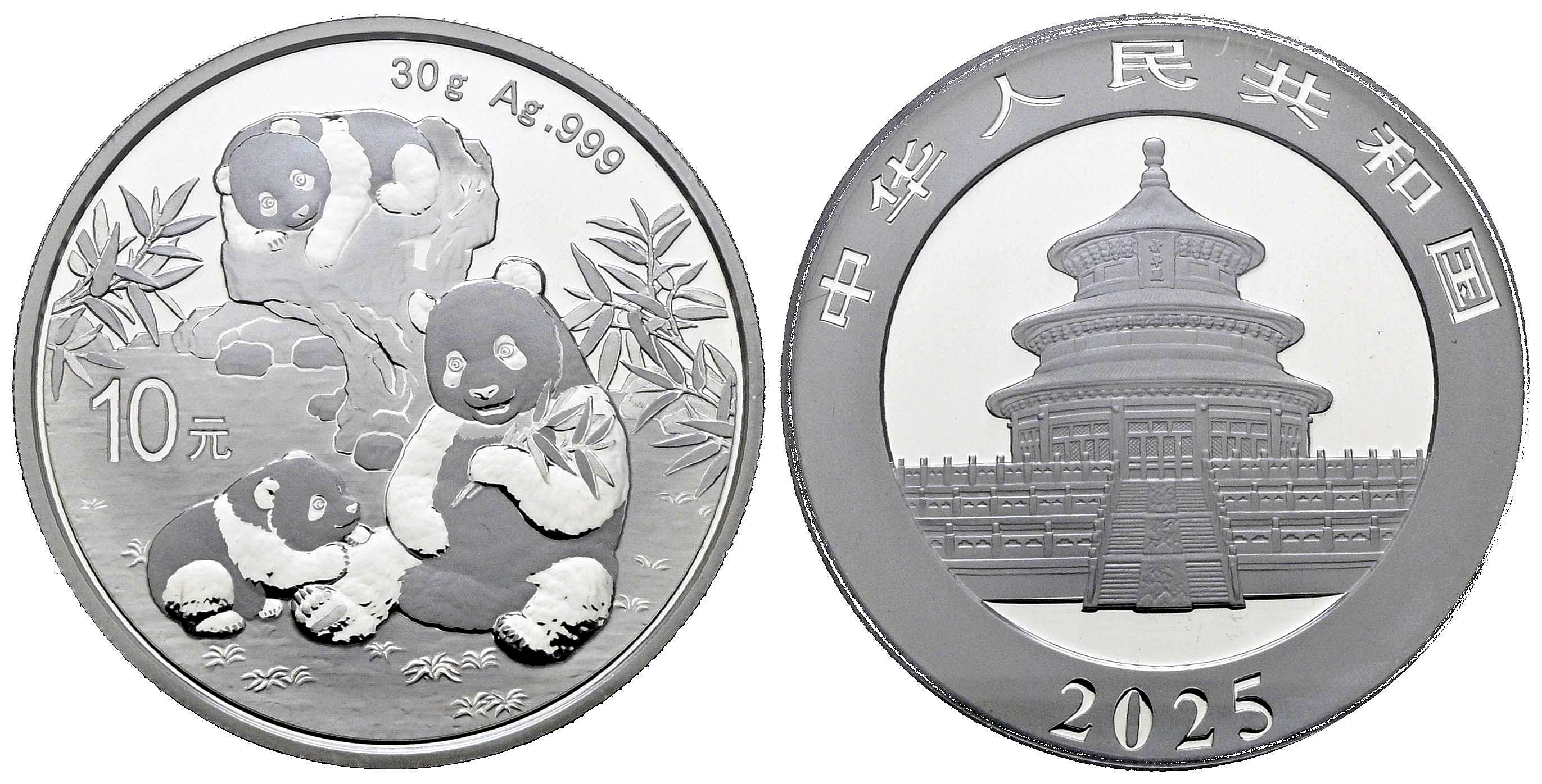 CHINA. 10 Yuan. (Ar. 30,00g/40mm)*. 2025. Serie Panda. Encapsulado por PCGS MS 70, First Day of Issue. *Peso y medidas teóricos.