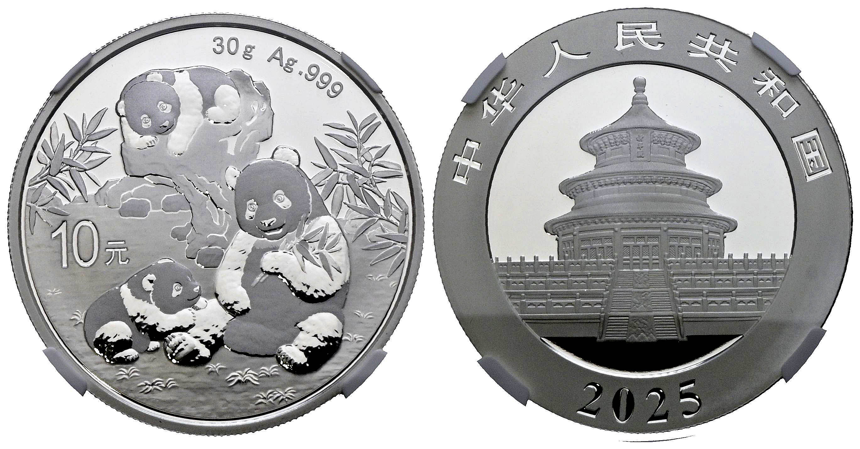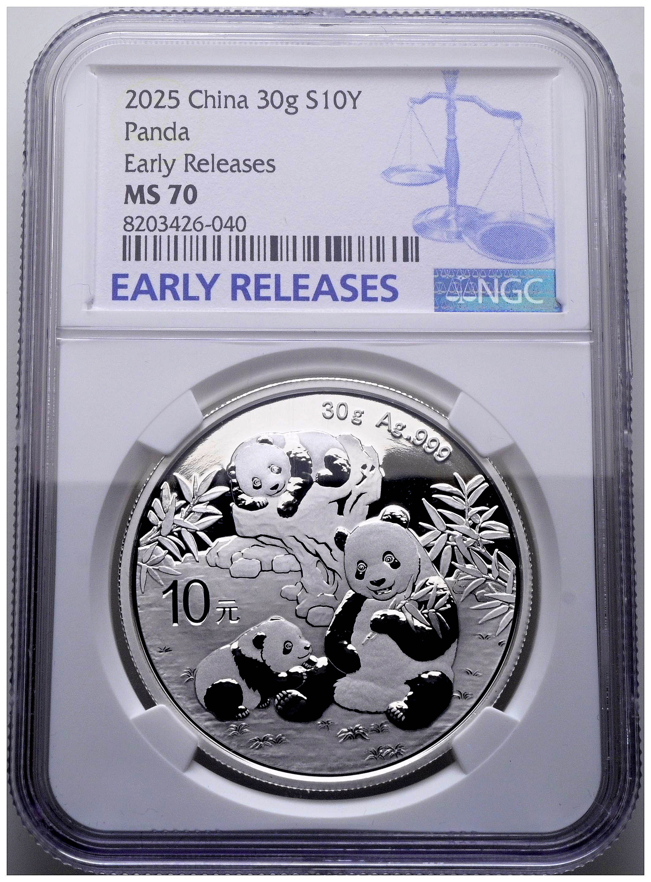 CHINA. 10 Yuan. (Ar. 30,00g/40mm)*. 2025. Serie Panda. Encapsulado por NGC MS 70, Early Releases. *Peso y medidas teóricos.