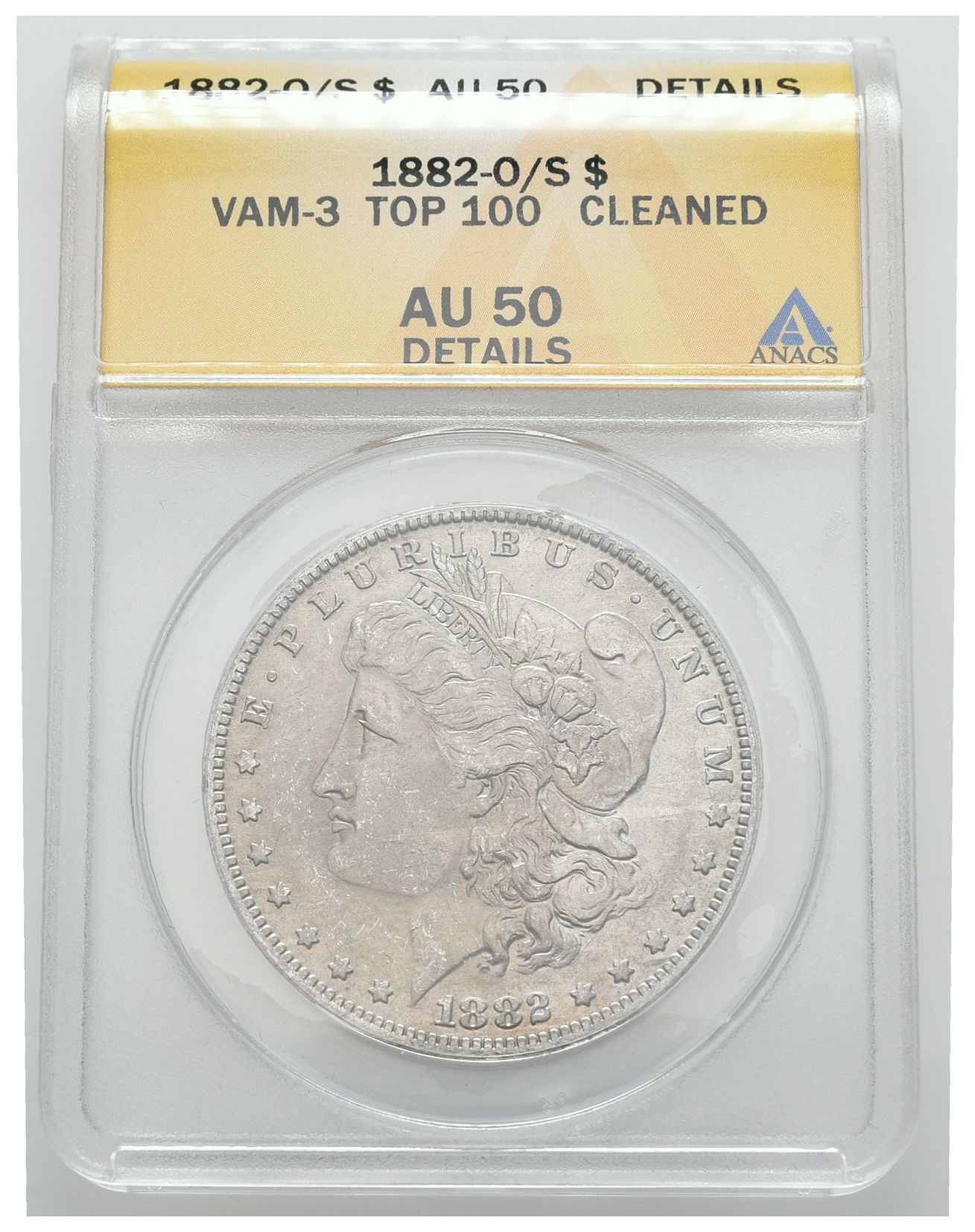 ESTADOS UNIDOS. 1 Dollar (Ar. 26,73g/38mm)*. 1882. Nueva Orleans O-S. VAM-3. TOP 100. (Km#110). Limpiada. Encapsulado por ANACS AU50 Details. *Peso y medida teórico.