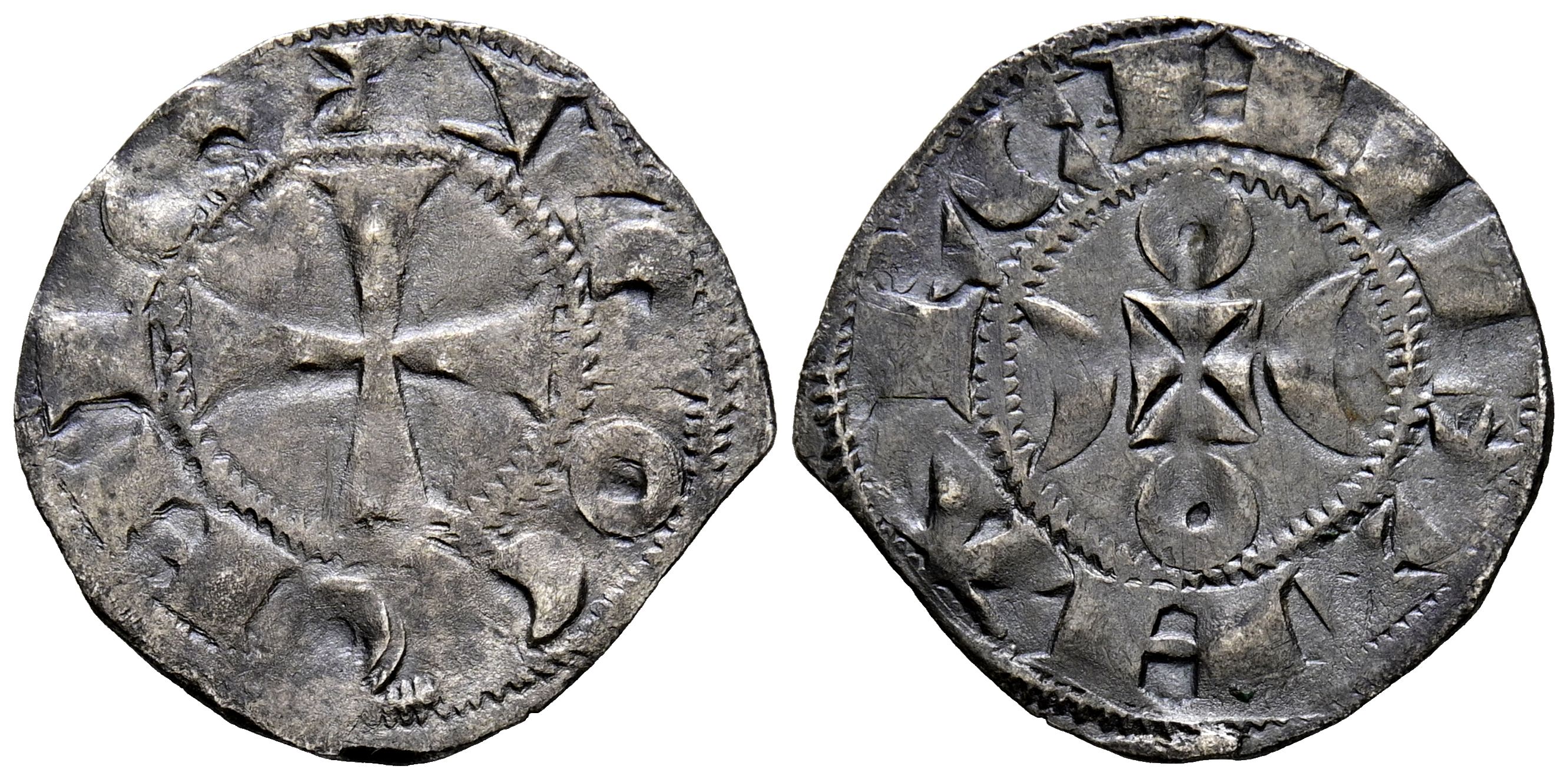 FRANCIA, Hugo IX (1199-1219). Dinero. (Ar. 0,80g/18mm). Condado La Marche. Anv: Cruz patada dentro de una gráfila circular, alrededor leyenda: VGO COMES. Rev: Cruz con anillos sobre y debajo de ella y crecientes a los lados, todo dentro de una gráfila circular, al rededor leyenda: MARCHIE. MBC.