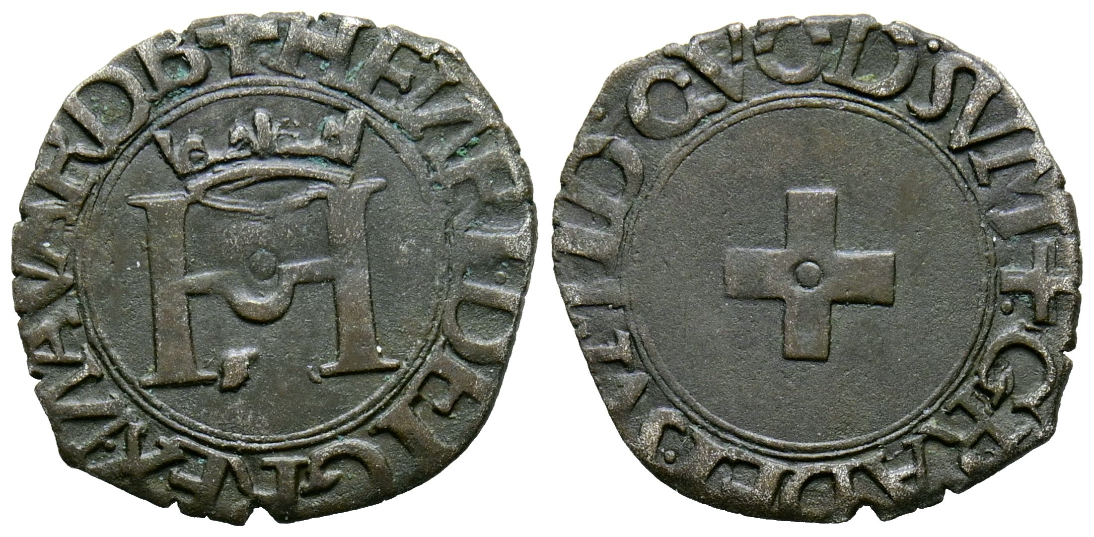 FRANCIA, Enrique de Albret (1516-1555). Liard. (Ve. 0,82g/16mm). Bearn (Navarra francesa). (Duplessy 1291, tipo cruz pequeña). Anv: H coronada, alrededor leyenda: HENRI DEI G REX NAVAR D B. Rev: Cruz pequeña dentro de gráfila, alrededor leyenda: GRA DEI SVM ID QVOD SVM. MBC.
