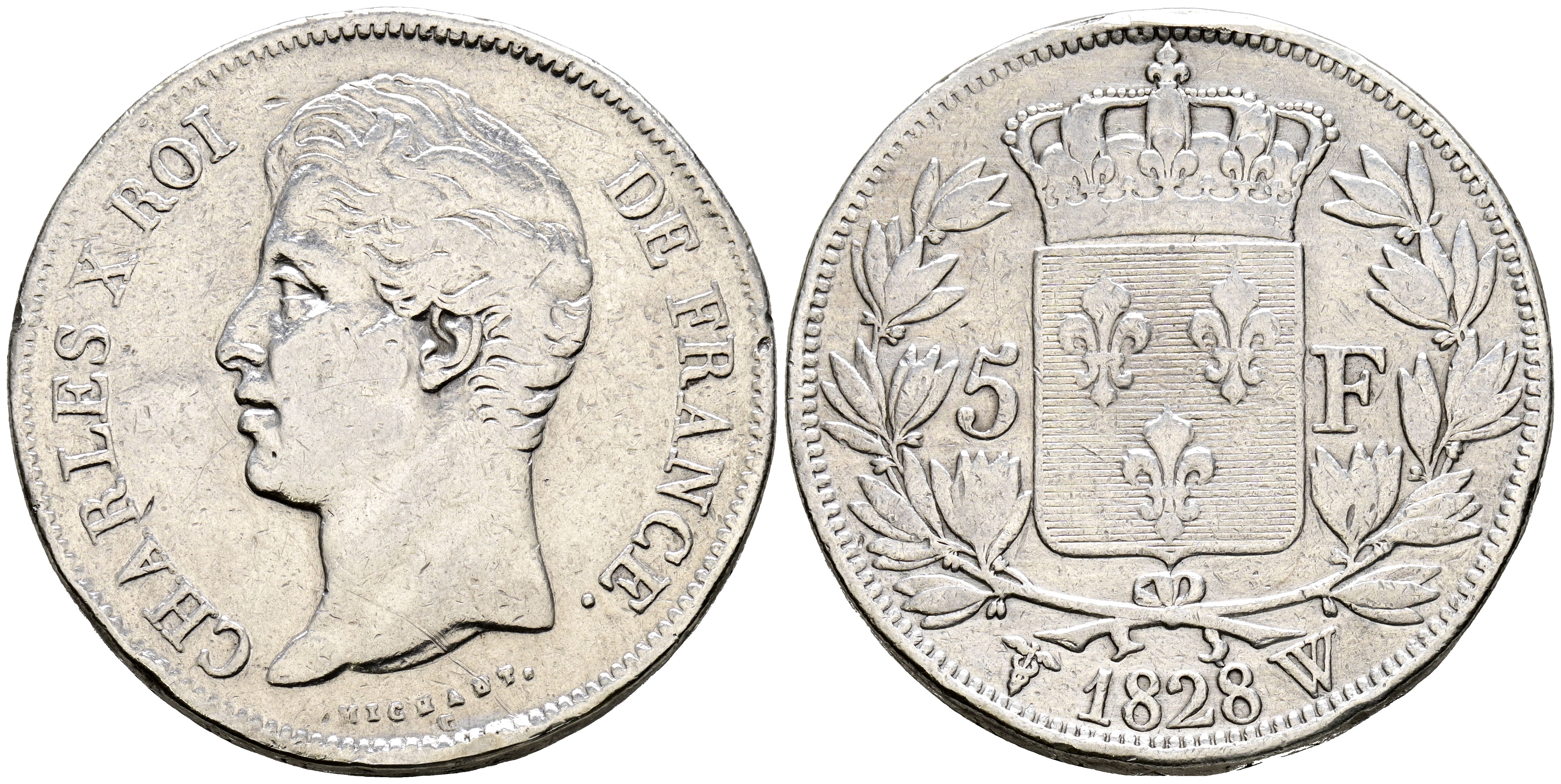 FRANCIA. 5 Francs (Ar. 24,82g/36mm). 1828. Carlos X. Lille W. (Km#728.13). MBC-. Limpiado.