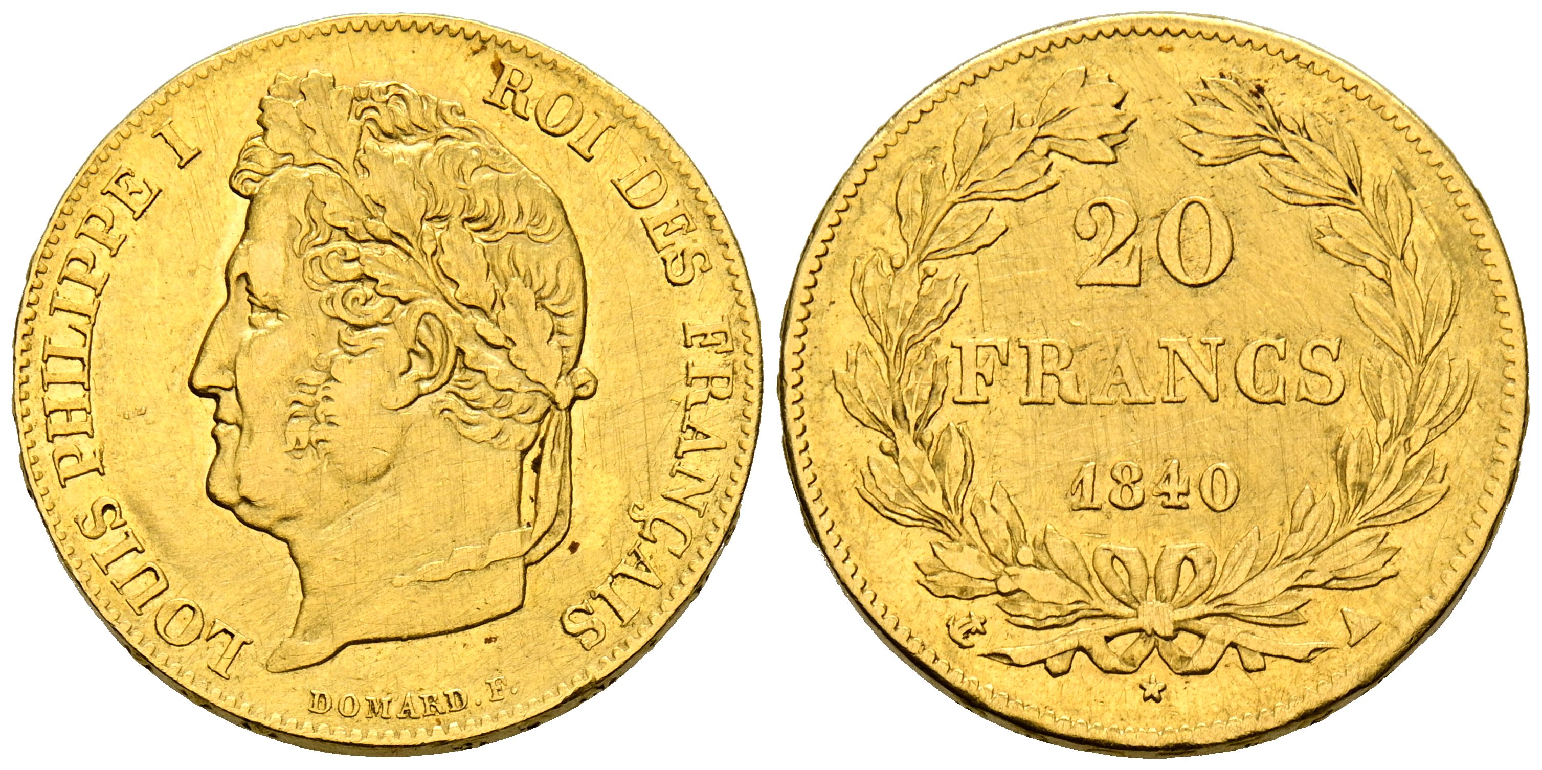FRANCIA, Luis Felipe I. 20 Francos. (Au. 6,42g/21mm). 1840. París A. (Km#750.1). MBC. Limpiado.
