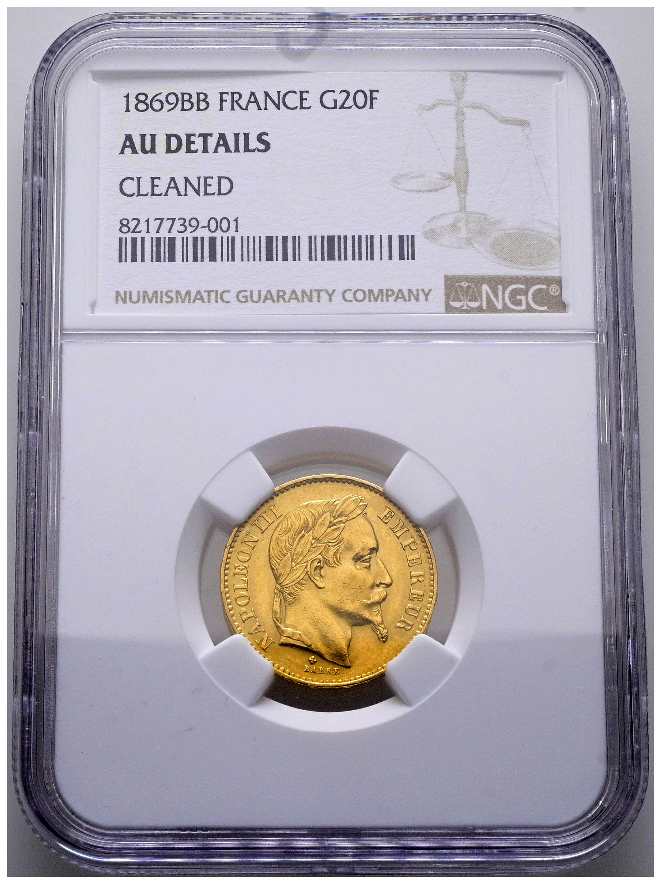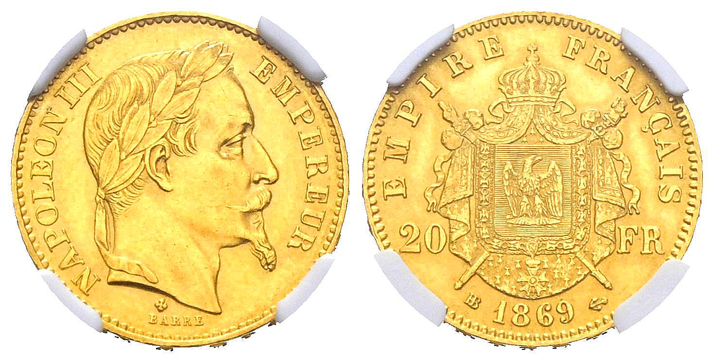 FRANCIA, Napoleón III. 20 Francs. (Au. 6,45g /21mm)*. 1869. Estrasburgo BB. (Km#801.2). Encapsulada por NGC AU Details. *Peso y medida teóricos.