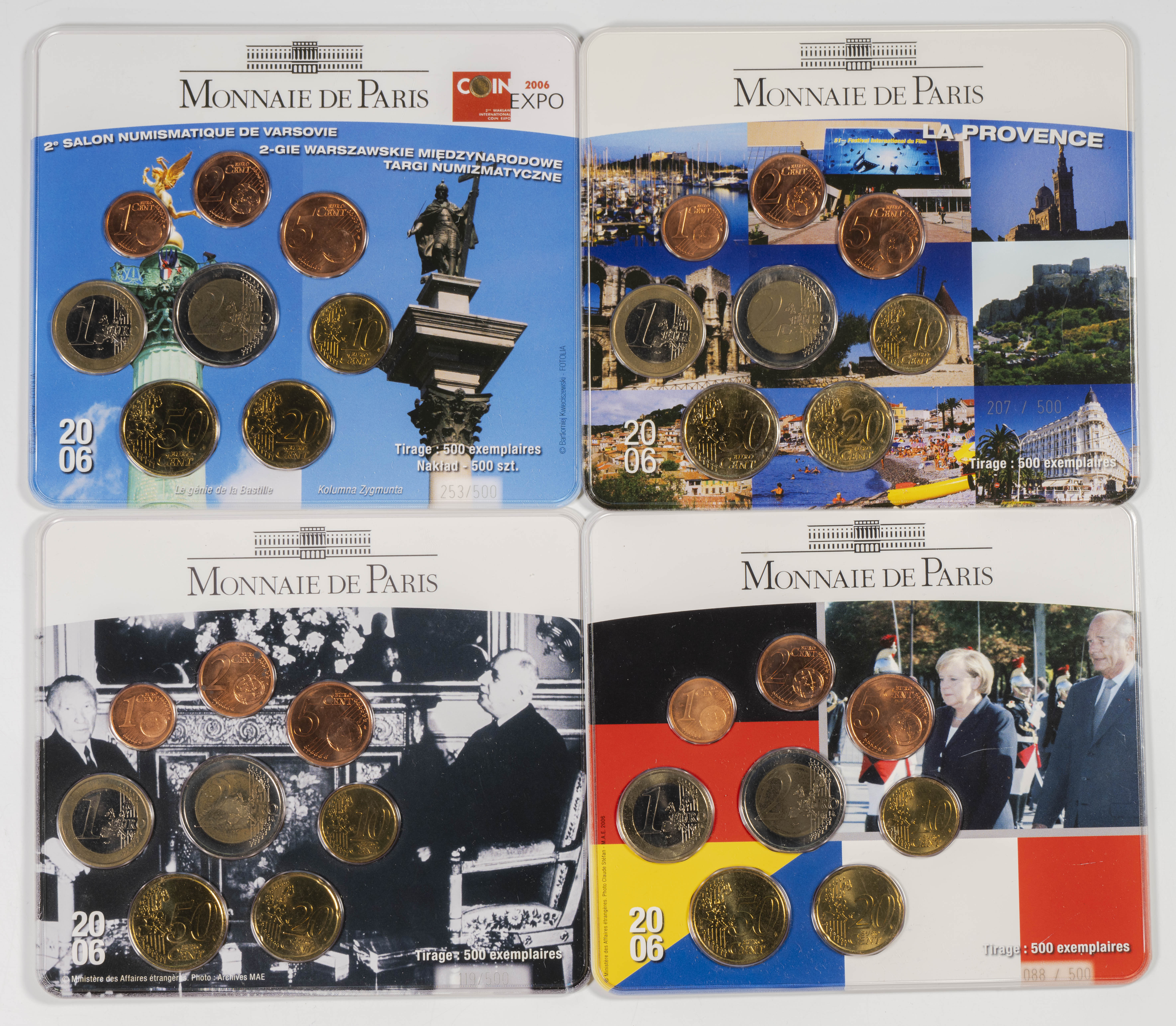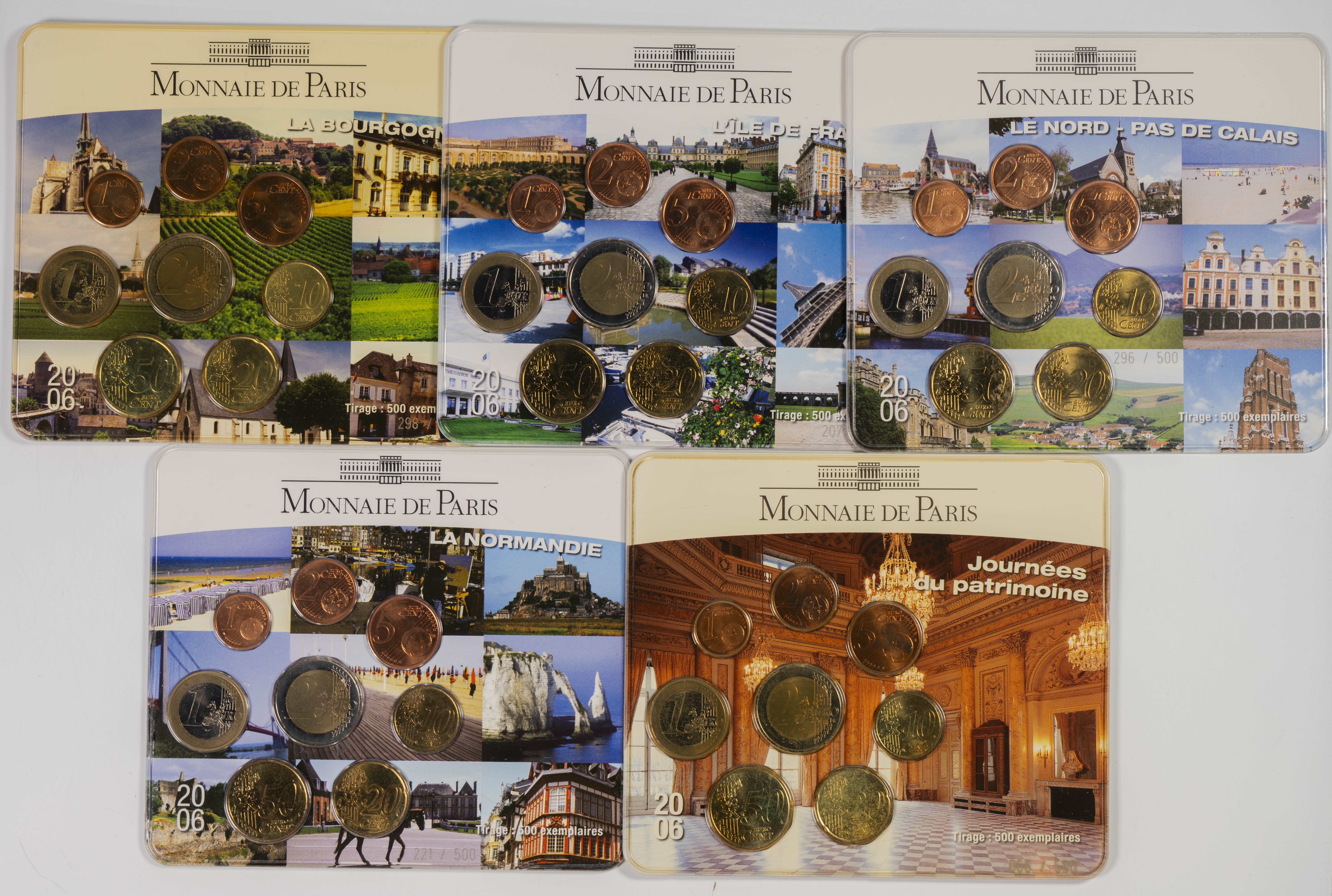 FRANCIA. Conjunto de 9 blisters completos con la serie de euros de 2006. Diferentes ilustraciones, correspondientes a tiras limitadas de 500 unidades numeradas en cada edición. A EXAMINAR.