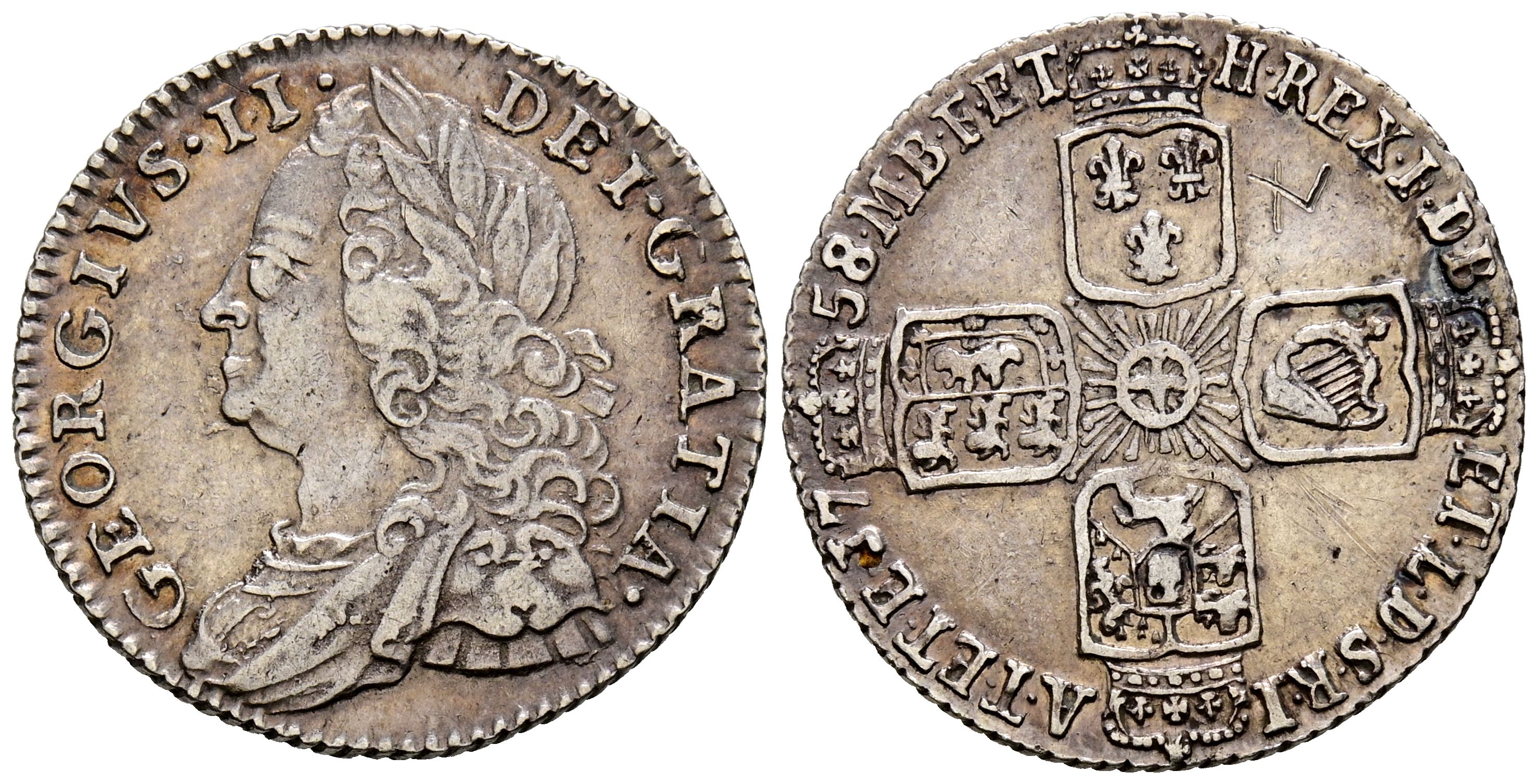 GRAN BRETAÑA. 1 Shilling (Ar. 2,96g/21mm). 1758. Jorge II. (Km#583.3). MBC+. Bonita pátina.
