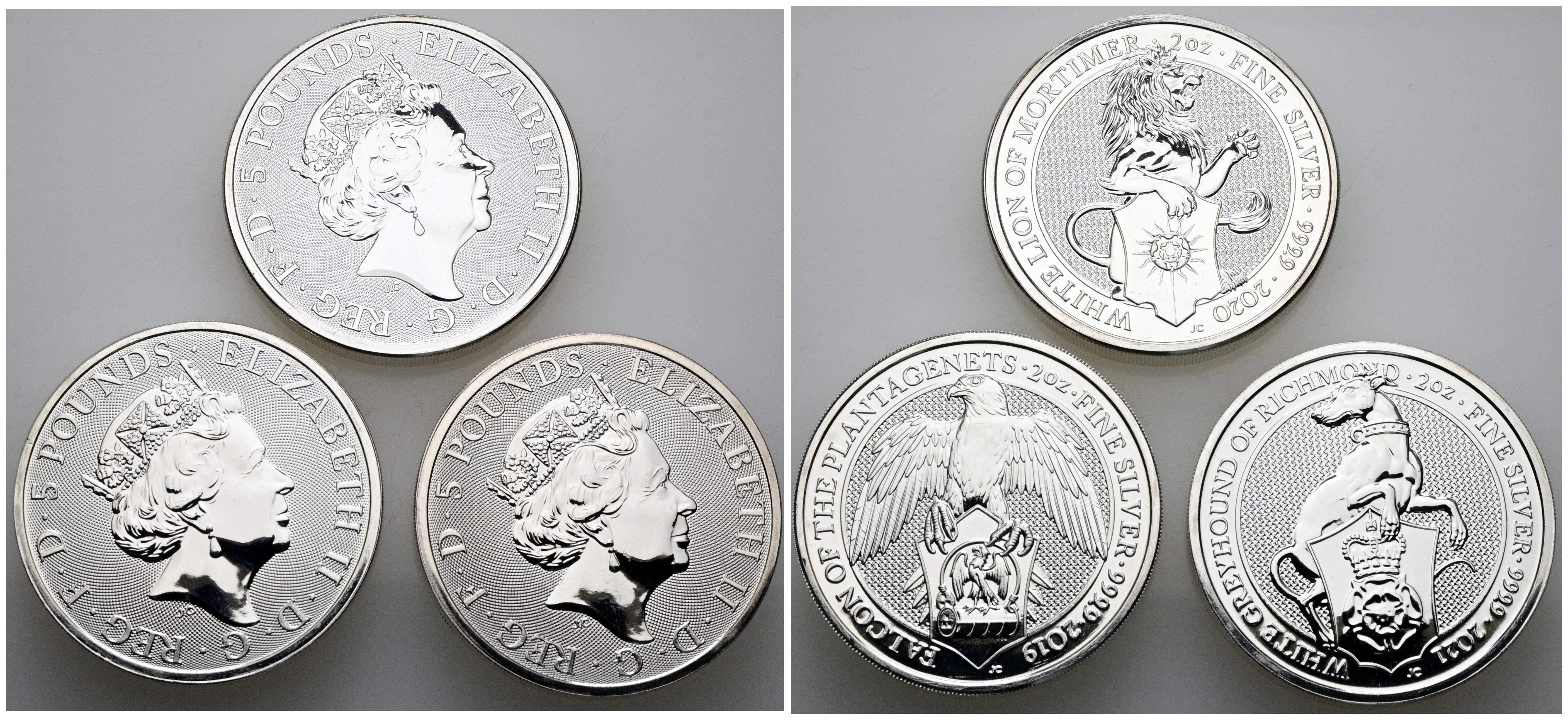 GRAN BRETAÑA. Conjunto de 3 piezas de 5 Pounds (2 Onzas) correspondientes a la serie del Bestiario de la Reina. 2019, 2020 y 2021. Peso total aproximado del conjunto: 187g. Plata de 0,999 milésimas. SC.