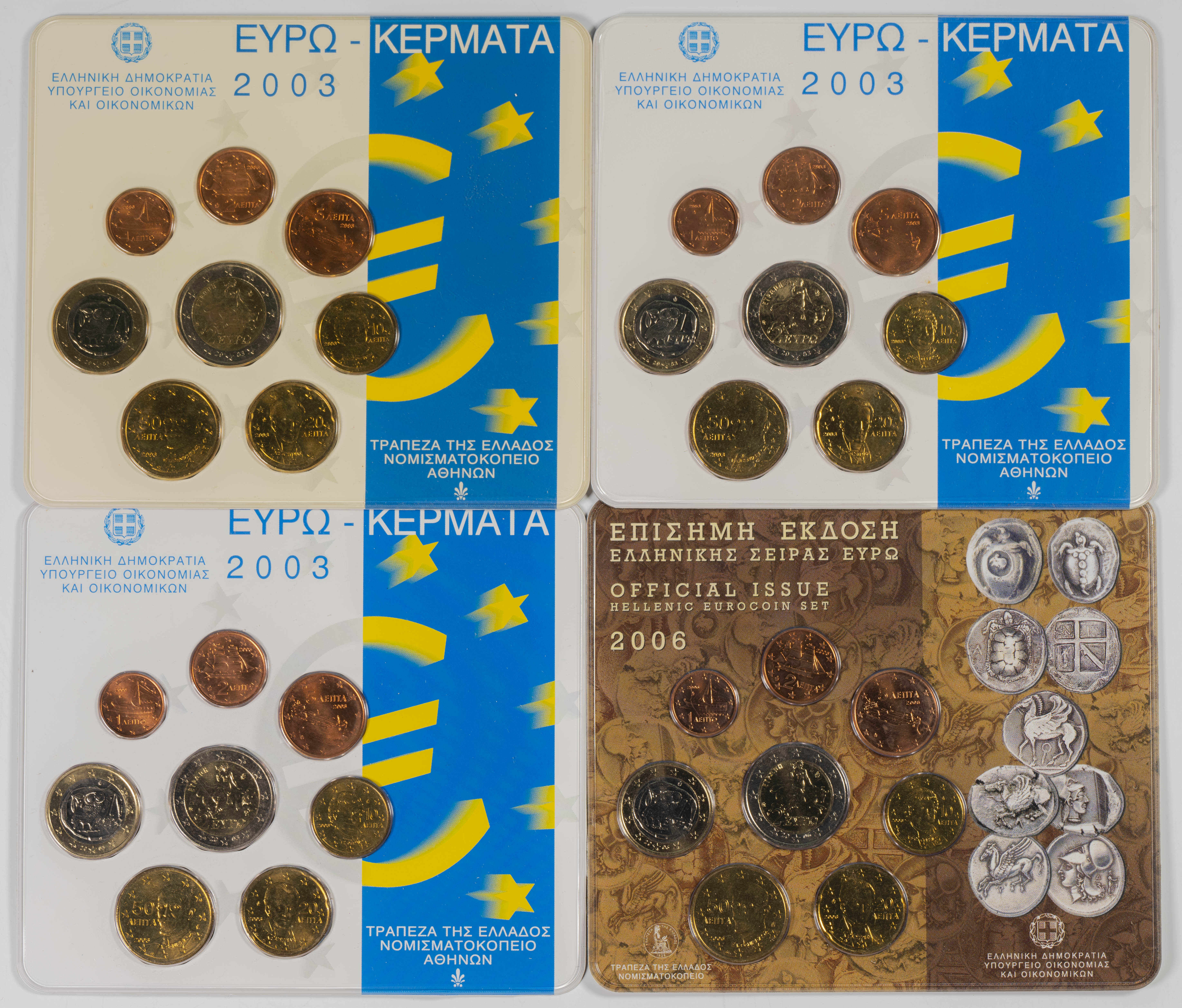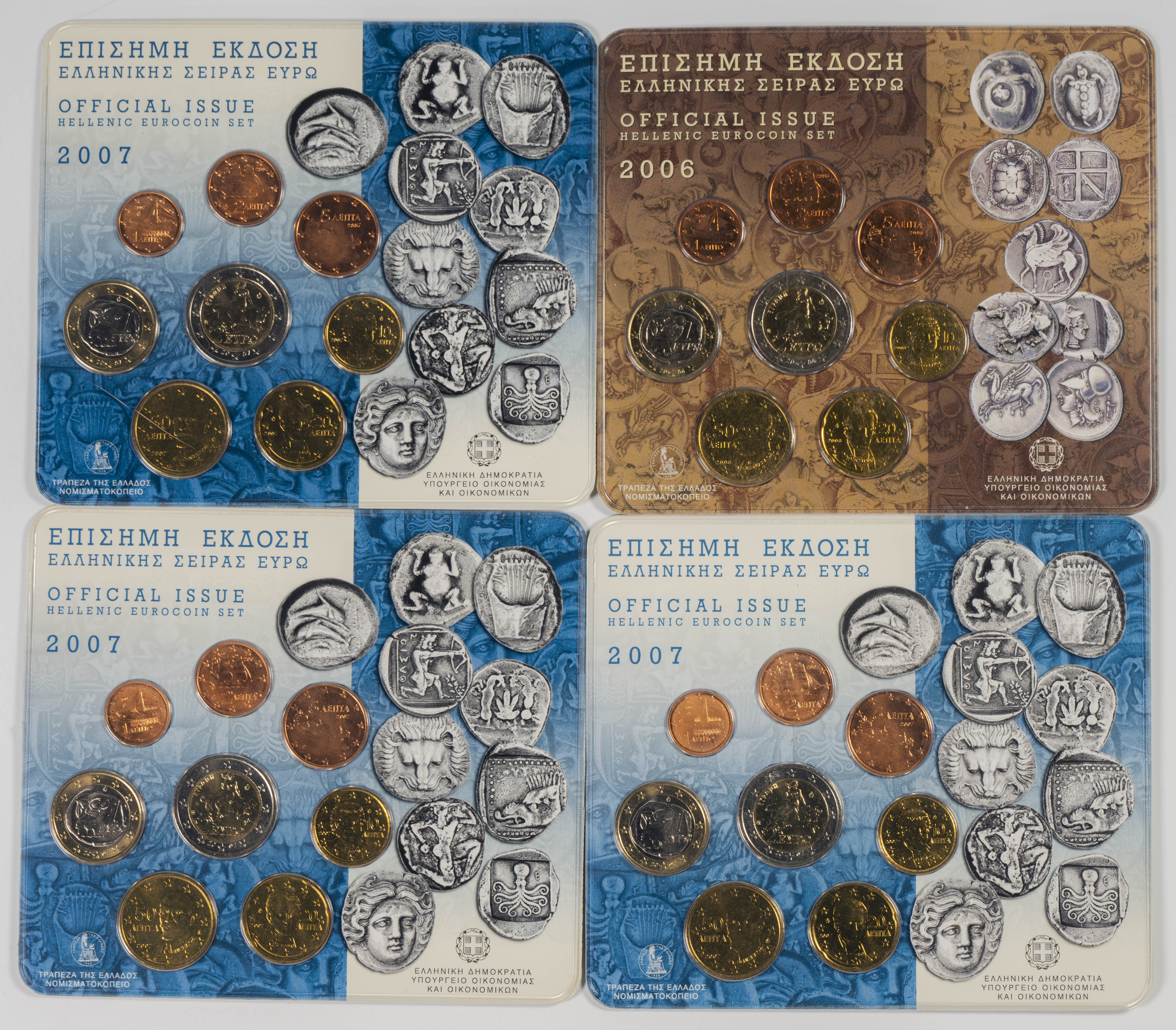 GRECIA. Conjunto de 8 blísters con series completas de Euros, acuñados en 2003 (3); 2006 (2) y 2007 (3). A EXAMINAR.