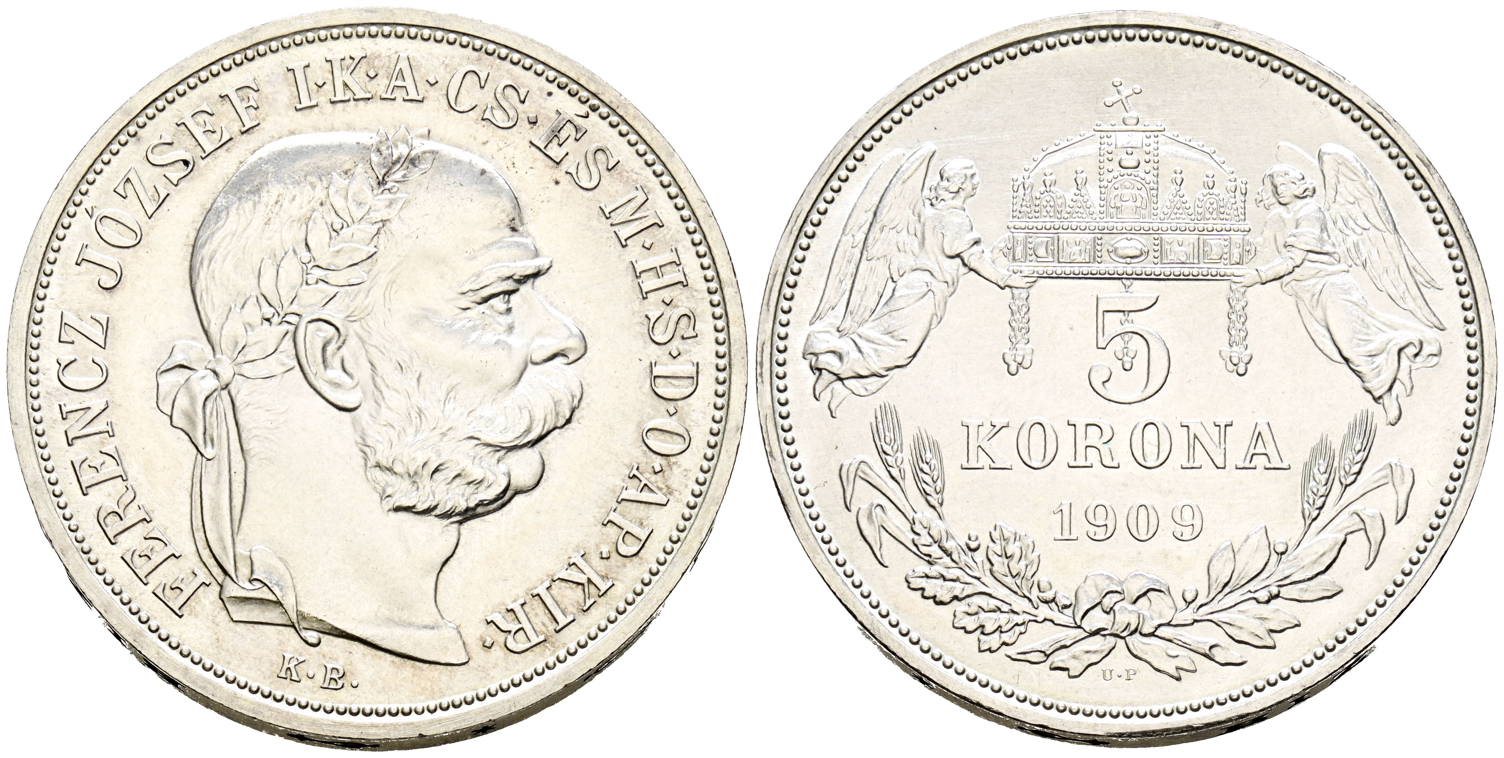 HUNGRÍA. 5 Coronas (Ar. 24,43g/36mm). 1909. UP. Reacuñación. Francisco José I. Imperio Austro-Húngaro. (Km#488). EBC+.