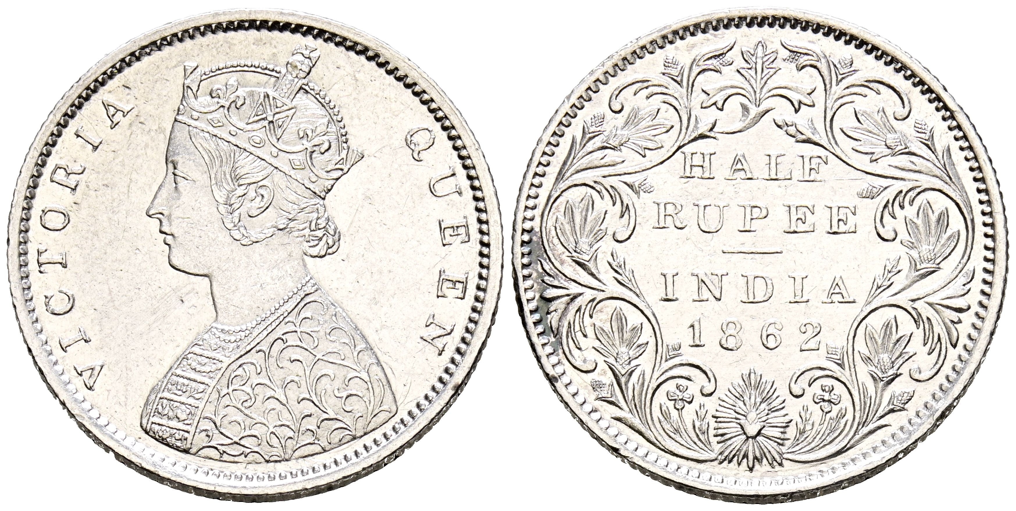 INDIA (Británica). 1/2 Rupia (Ar. 5,84g/25mm). 1862. Reina Victoria. (Km#472). MBC+. Marquitas.