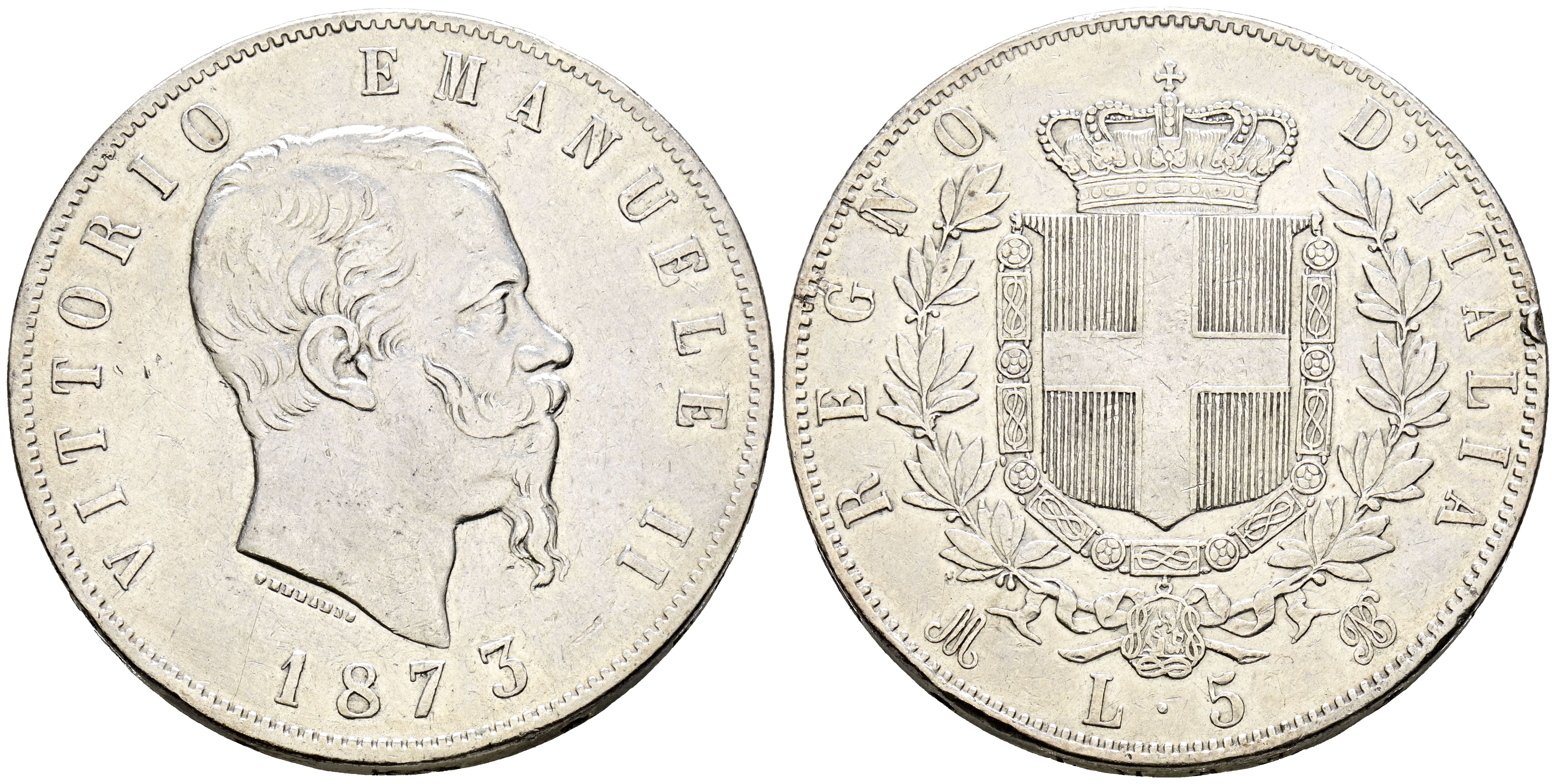 ITALIA. 5 Liras. (Ar. 24,81g/37mm). 1873. Victor Manuel II. Milán M. (Km#8.3). MBC.