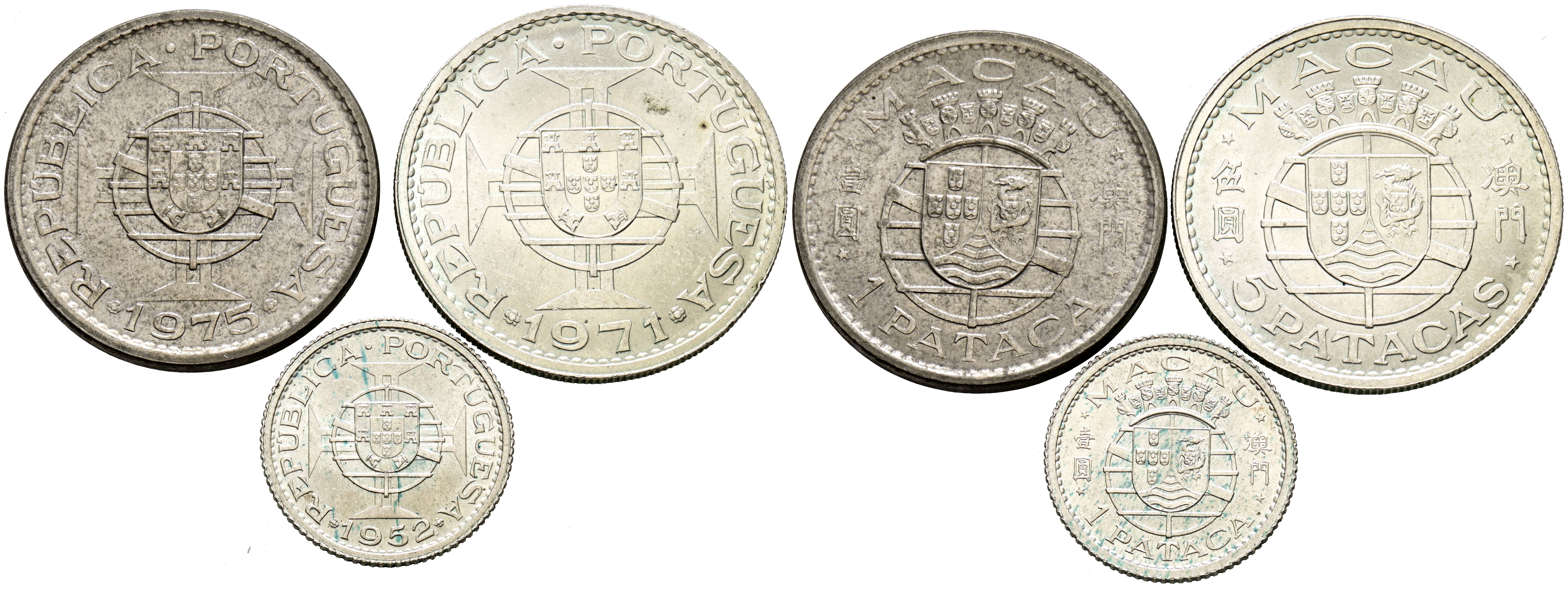MACAO (Portugués). Trio de platas con módulos de 1 y 5 Patacas. Fechas de acuñación 1952, 1971 y 1975. Diferentes estados de conservación. A EXAMINAR.