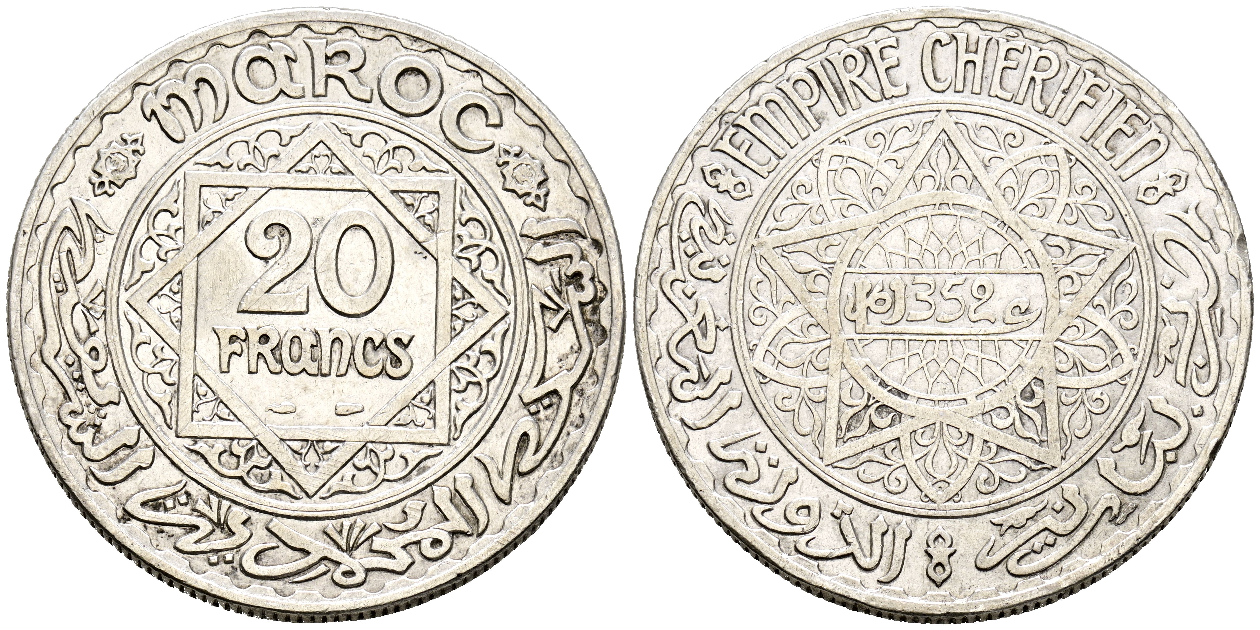 MARRUECOS. 20 Francs. (Ar. 19,81g/35mm). 1933 (1352H). París. (Km#39). MBC+.