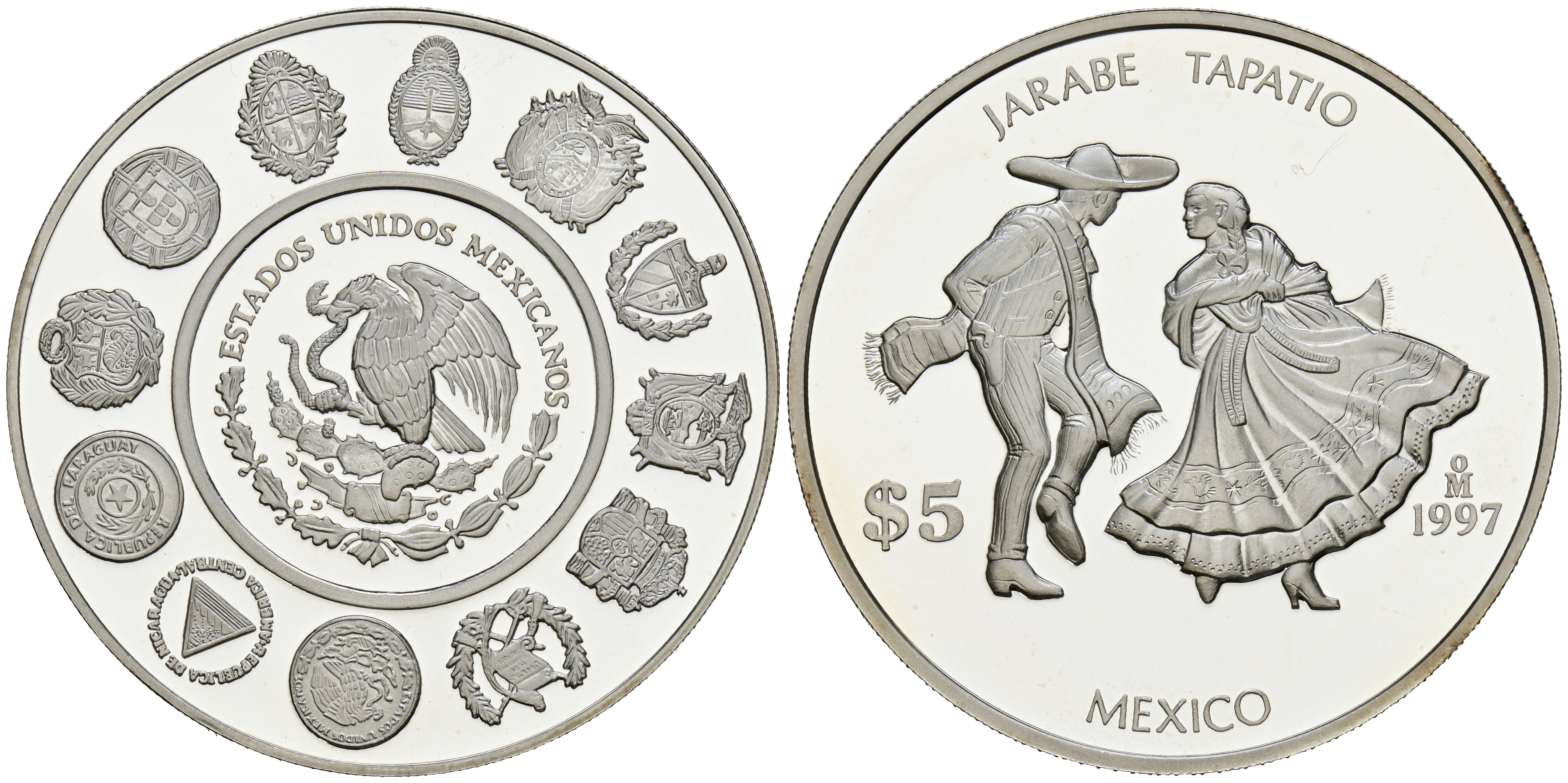 MÉXICO. 5 Pesos (Ar. 27,01g/39mm). 1997. Serie Iberoamericana: Jarabe Tapatio. (Km#629). PROOF. Levísimas rayitas. Escasa.
