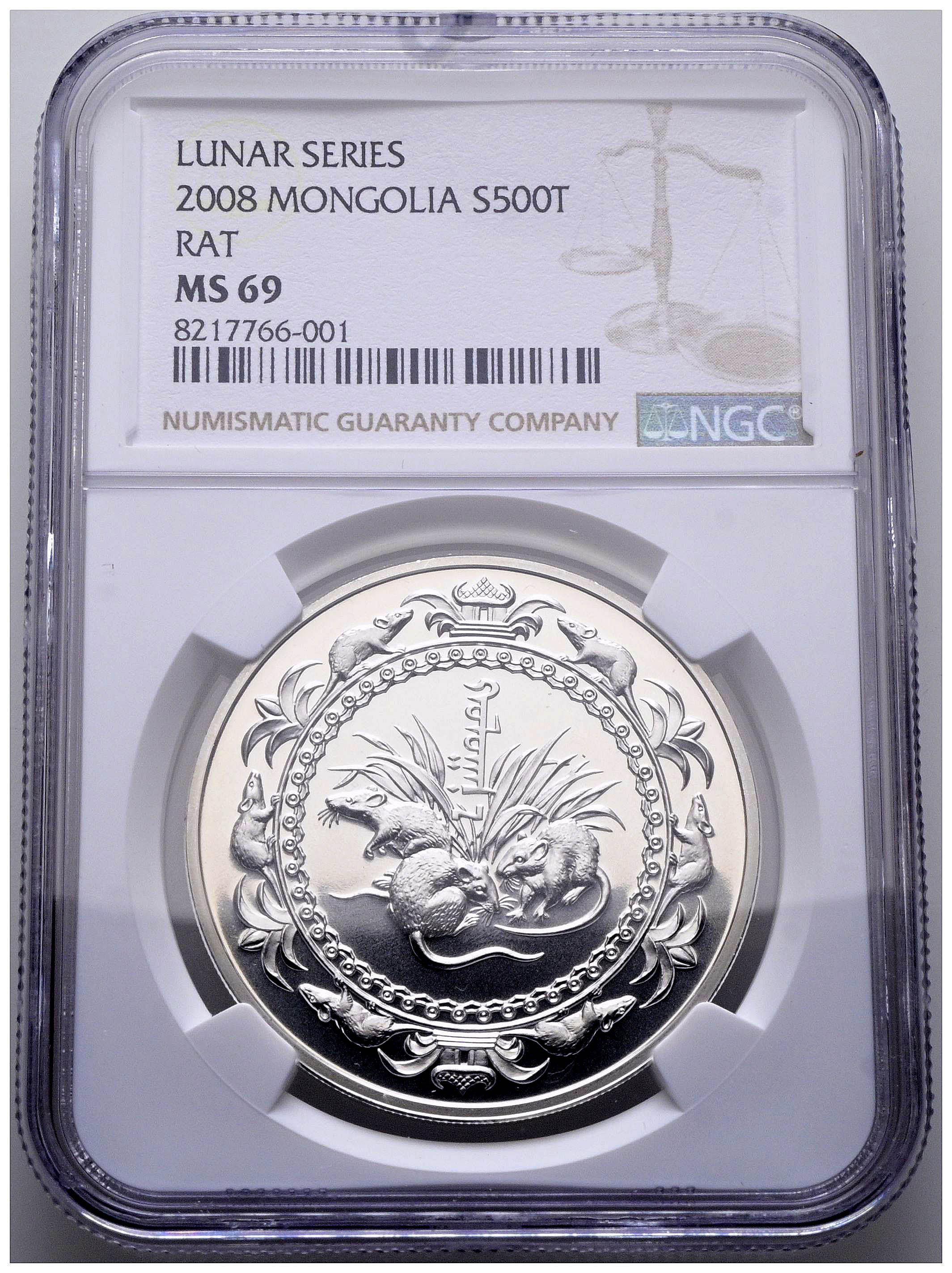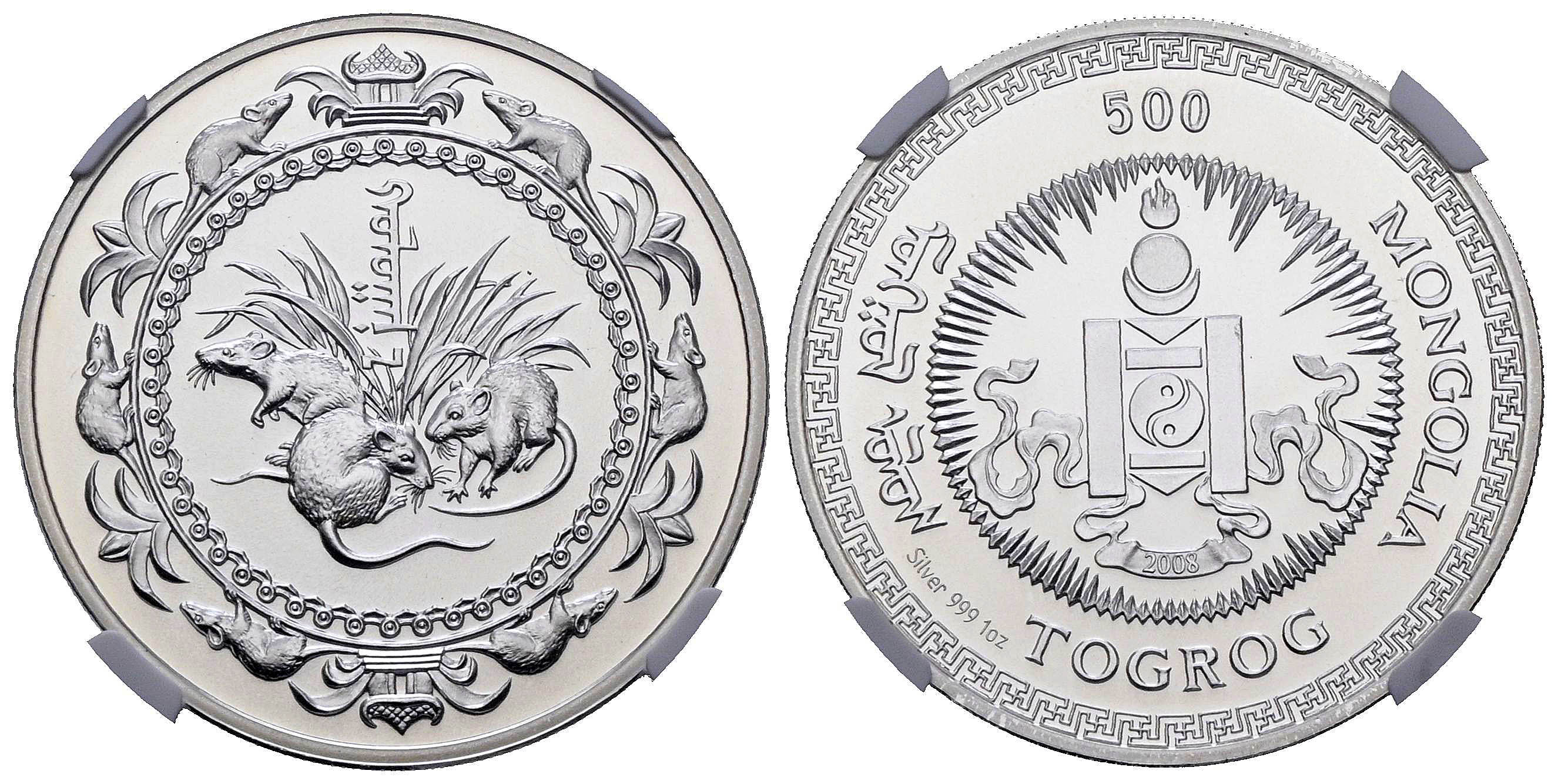 MONGOLIA. 500 Togrog. (Ar. 31,10g/39mm)*. 2008. Año de la rata. (Km#256). Encapsulada por NGC MS 69. Terminación PROOF. *Peso y medida teóricos. Escasa.