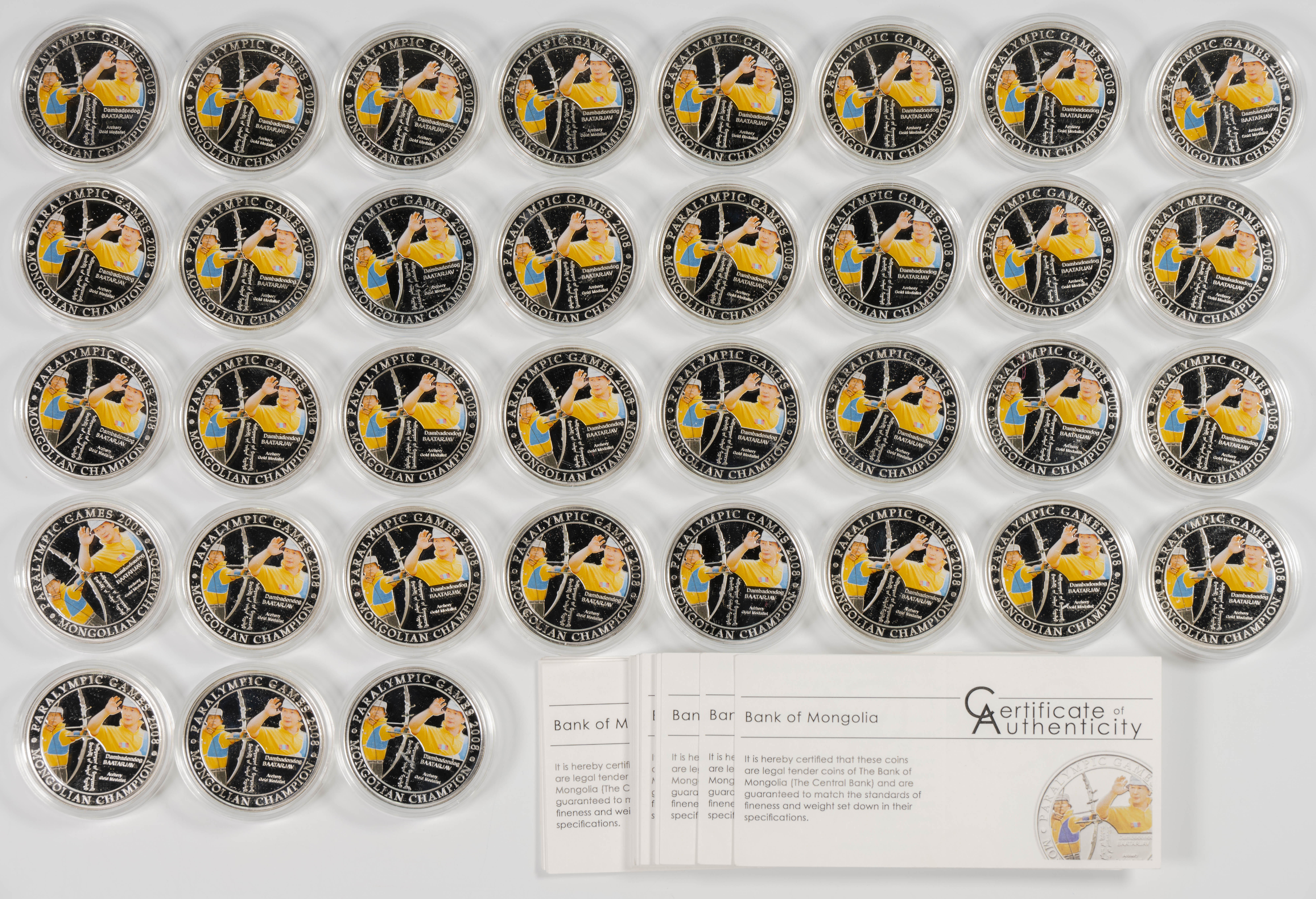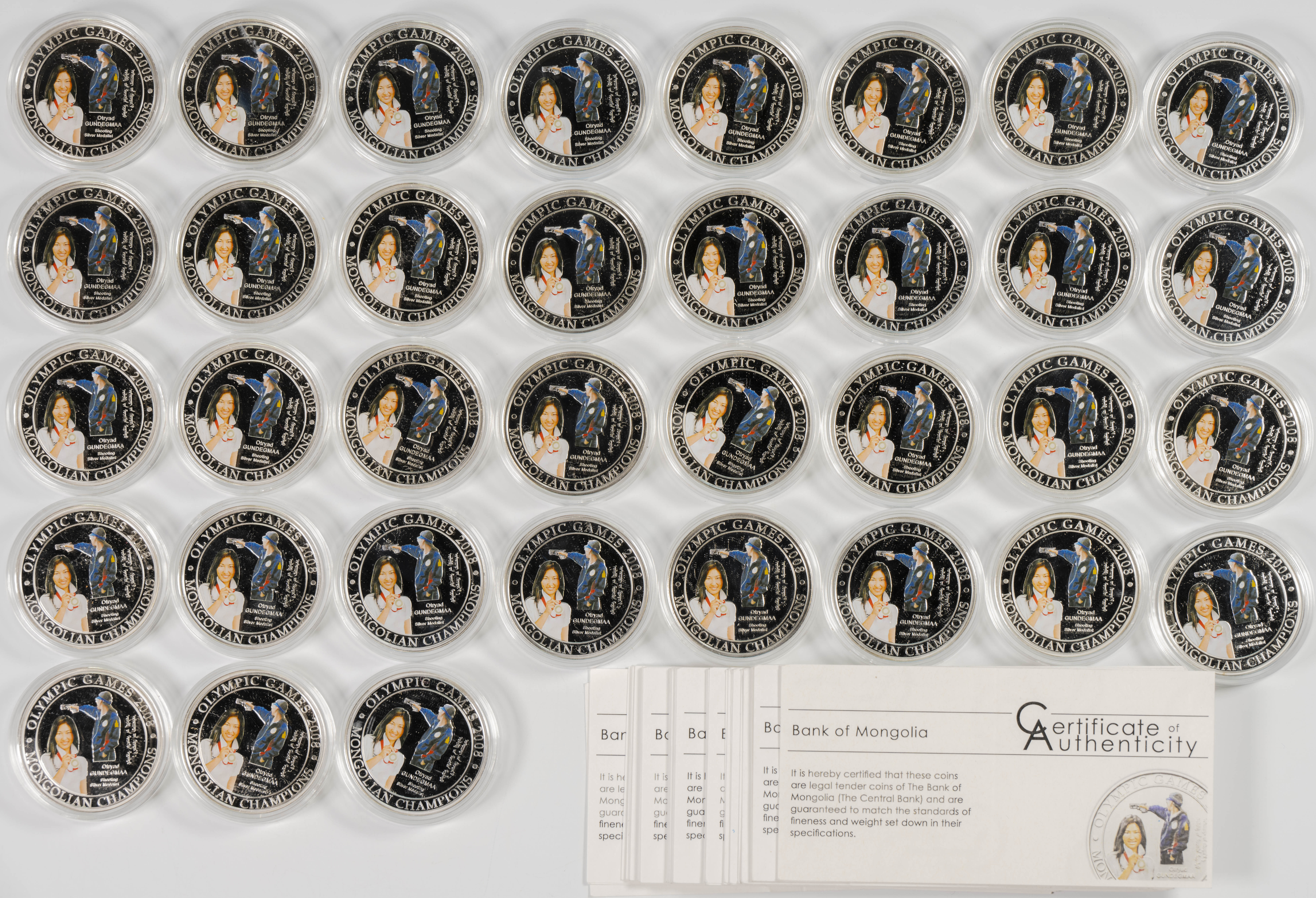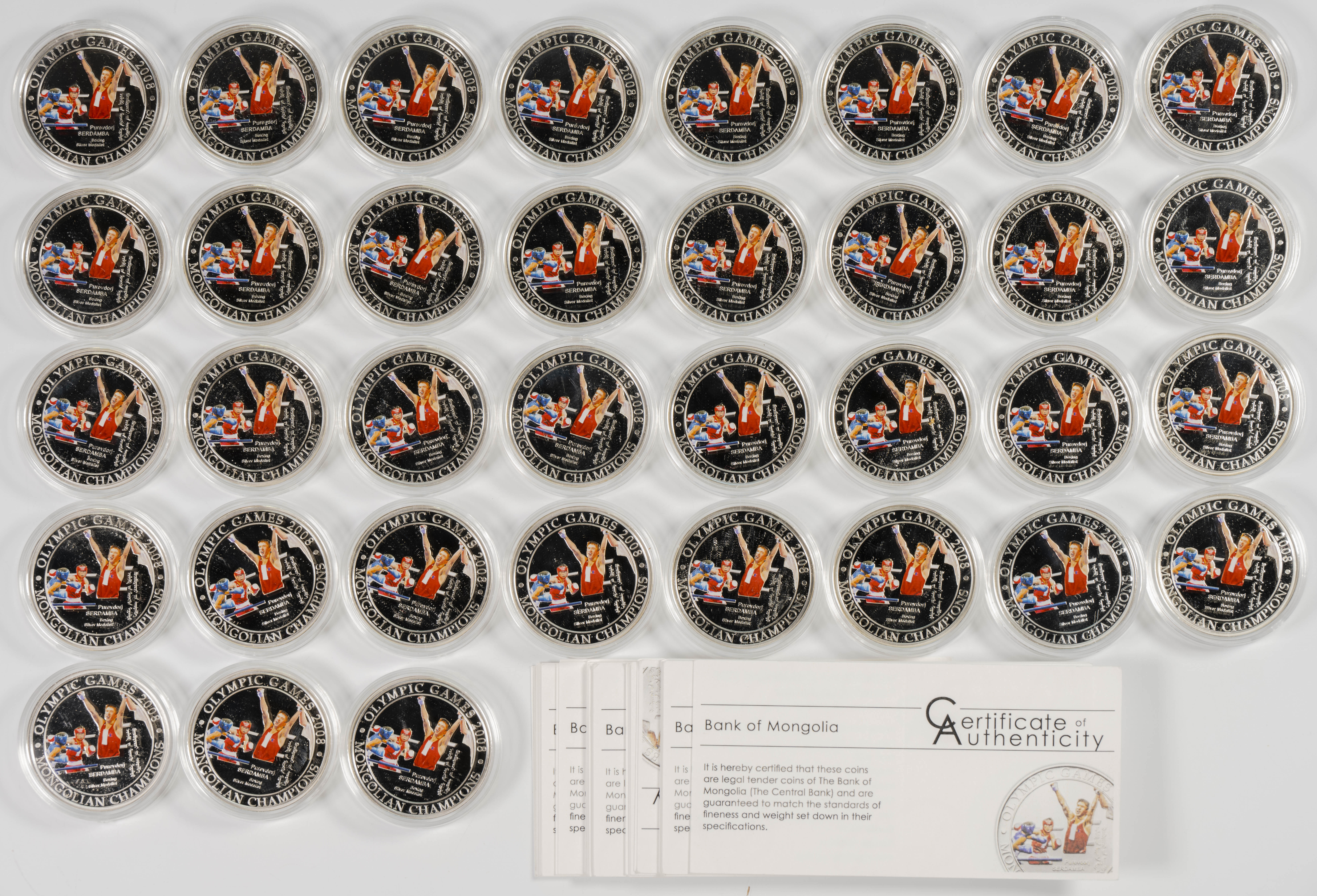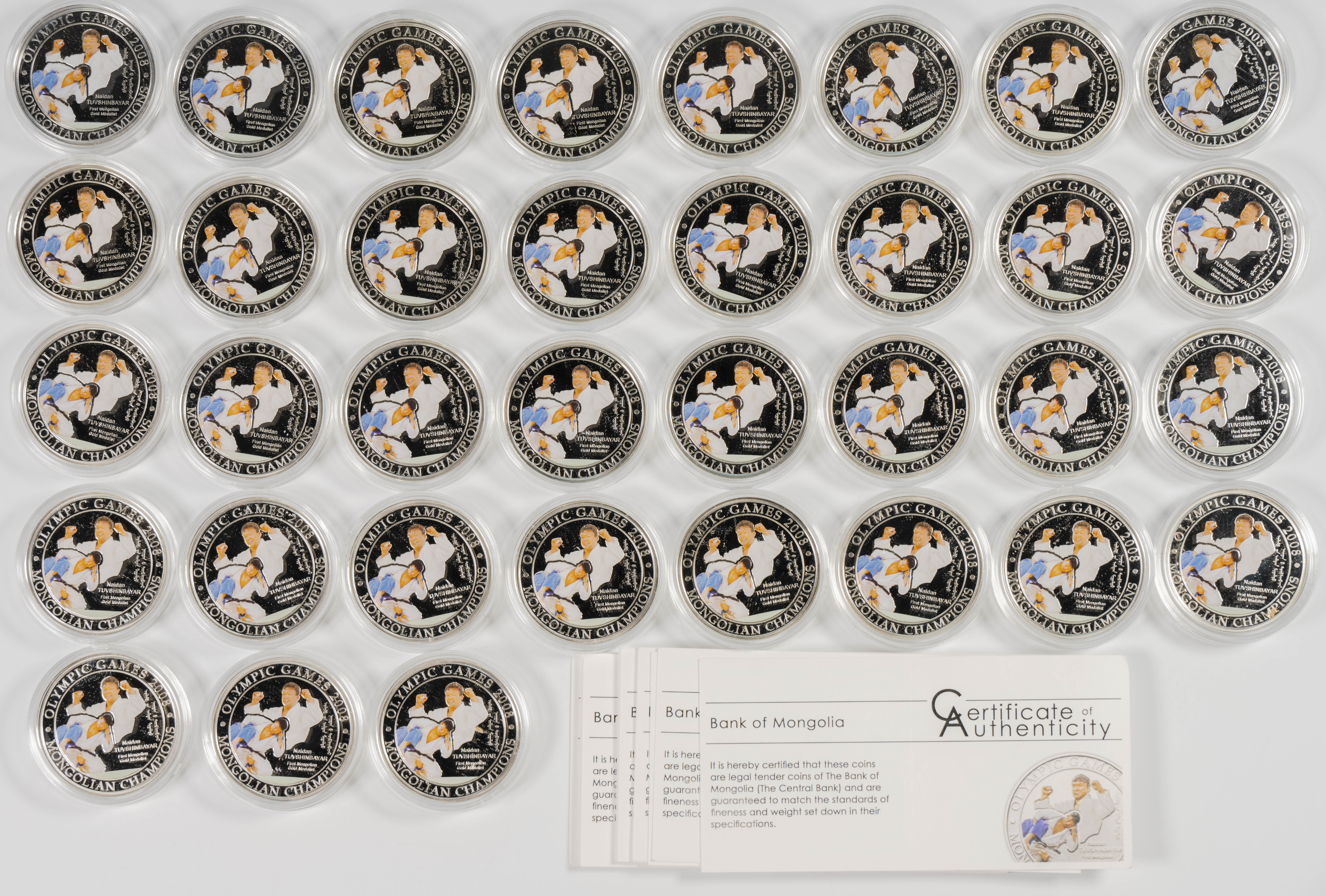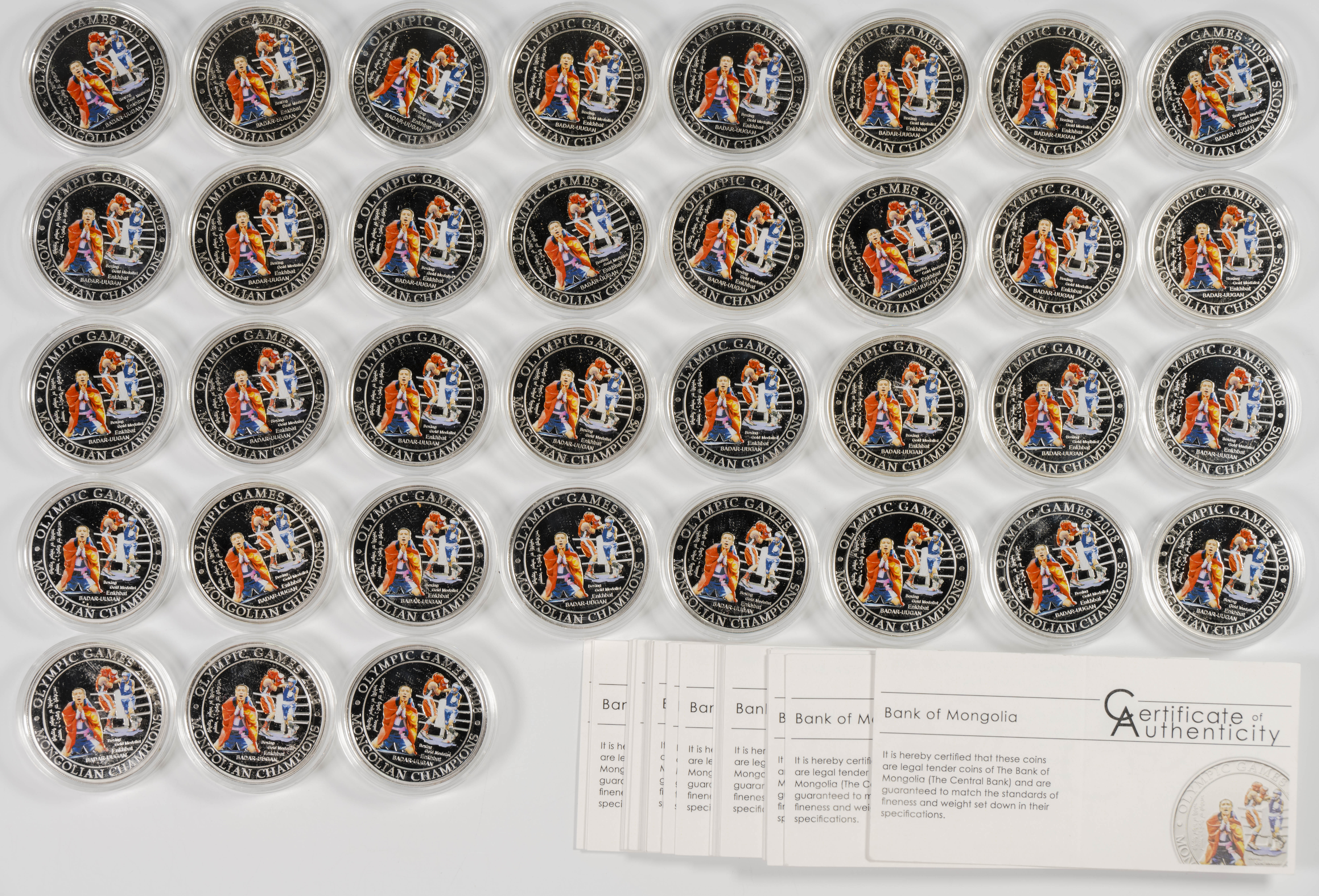 MONGOLIA. Colección de 175 monedas de plata de 500 Tugrik. 2008. Campeones Olímpicos. Tipos diferentes. Piezas en calidades PROOF y coloreadas. Peso total: 4.400 kilogramos. Plata de 0,925 milésimas. Incluyen cápsulas y una gran cantidad de certificados de autenticidad. A EXAMINAR.