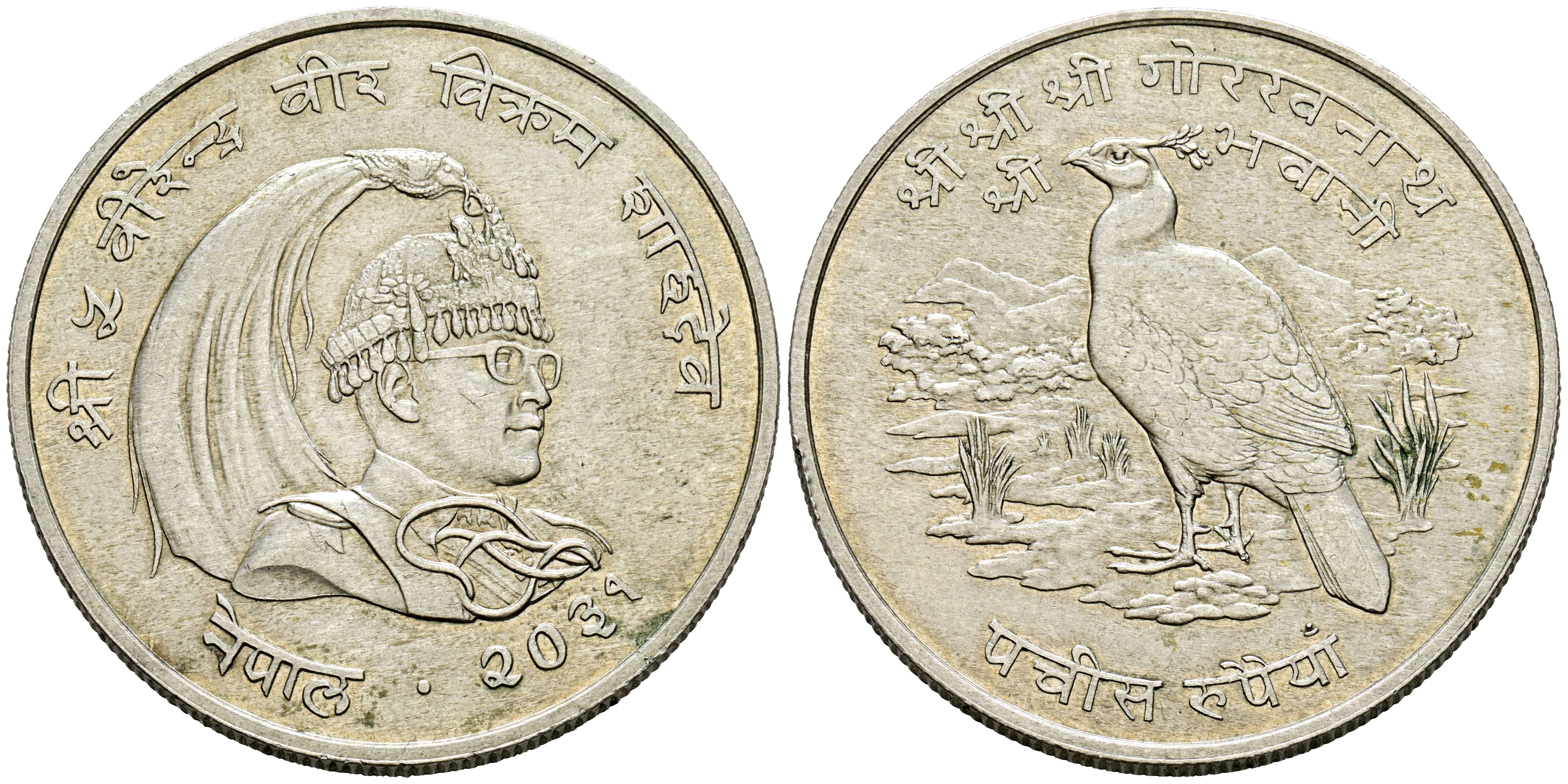 NEPAL. 25 Rupias (Ar. 25,77g/39mm). 1974. WWF: Monal Colirrojo. (Km#839). MBC+.