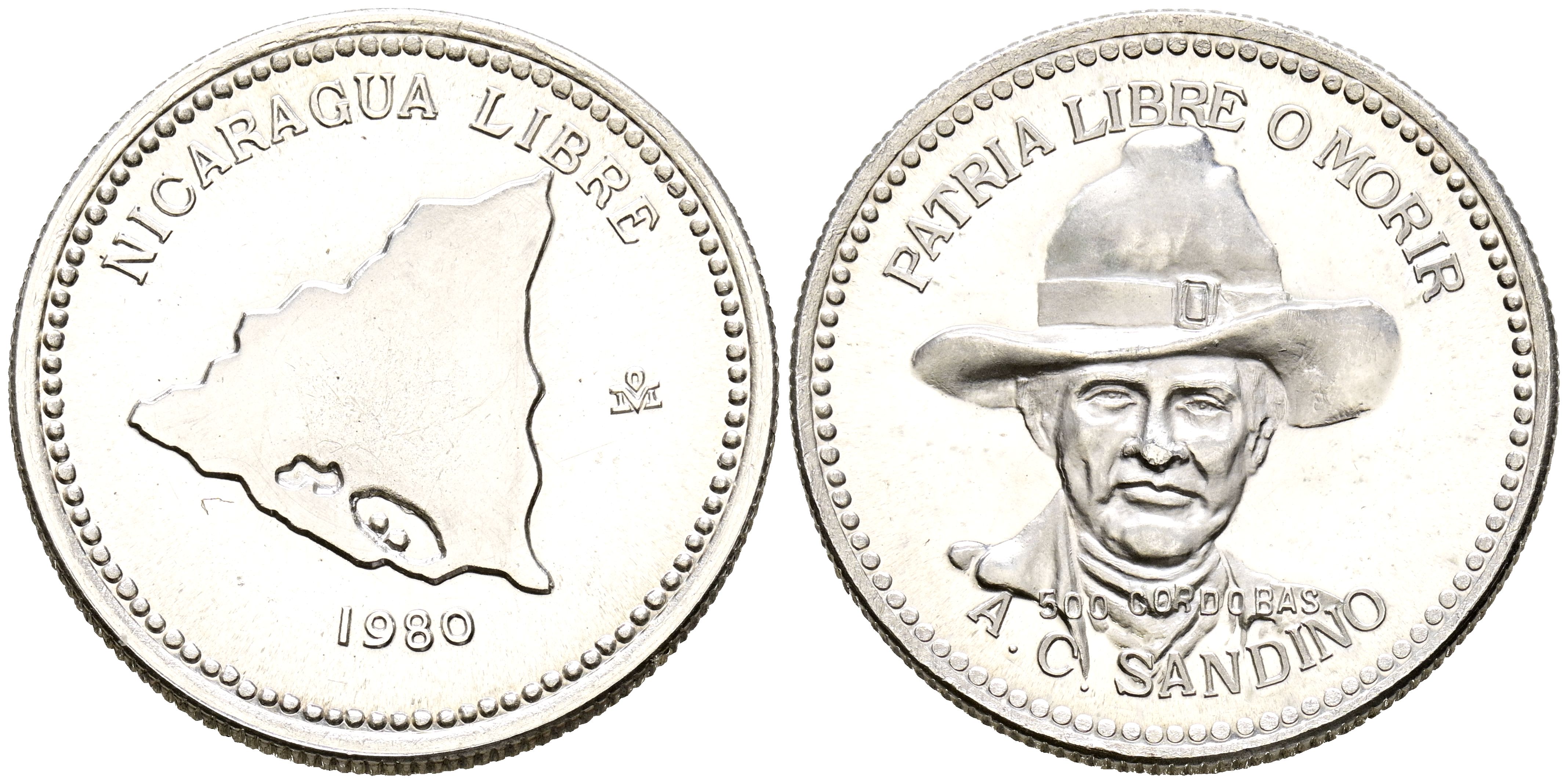 NICARAGUA. 500 Córdobas (Ar. 14,00g/30mm). 1980. Augusto César Sandino. México. (Km#45). PROOF. Leves marquitas.