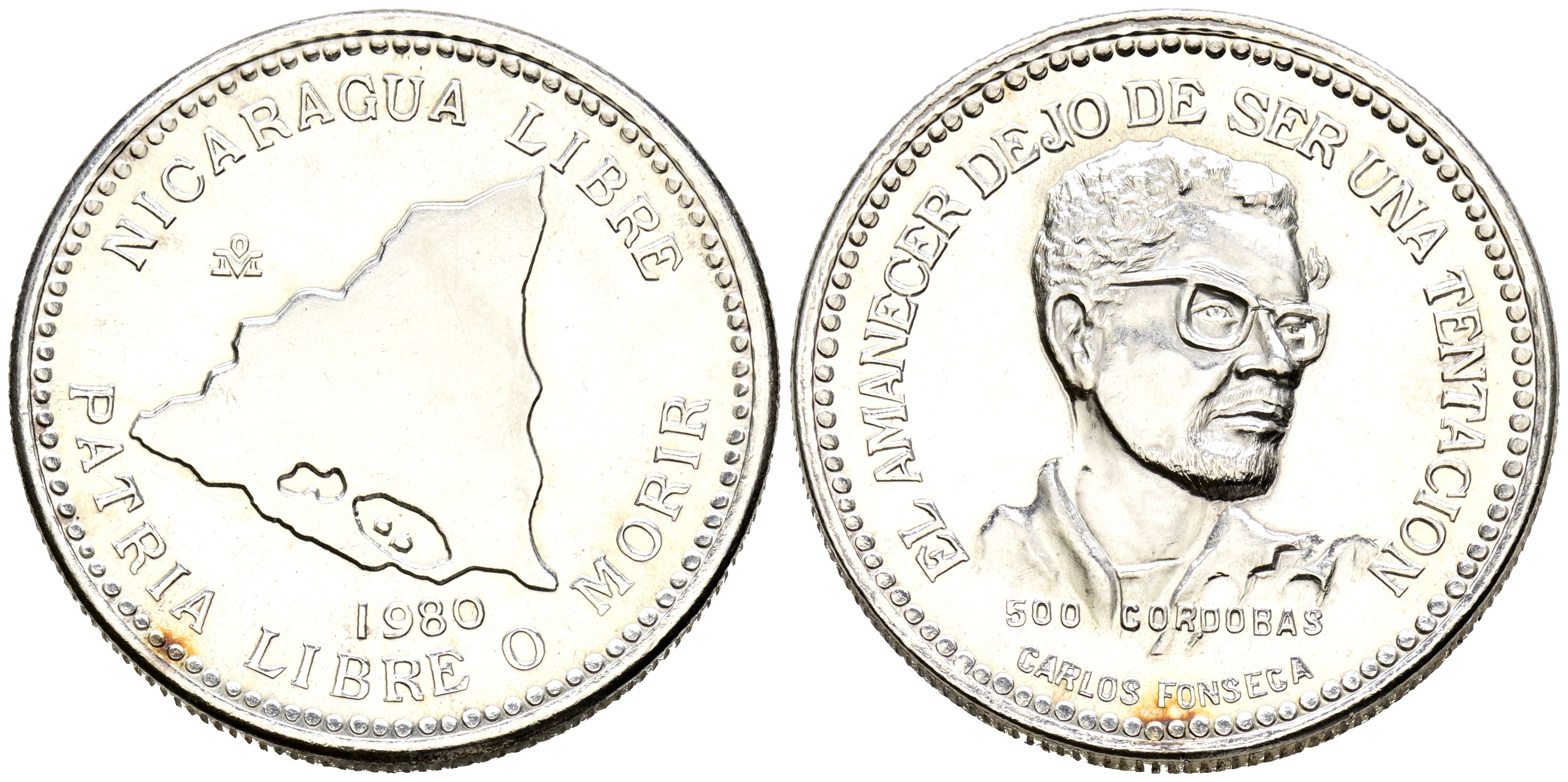 NICARAGUA. 500 Córdobas (Ar. 14,01g/30mm). 1980. Carlos Fonseca. México. (Km#46). PROOF. Leves marquitas.