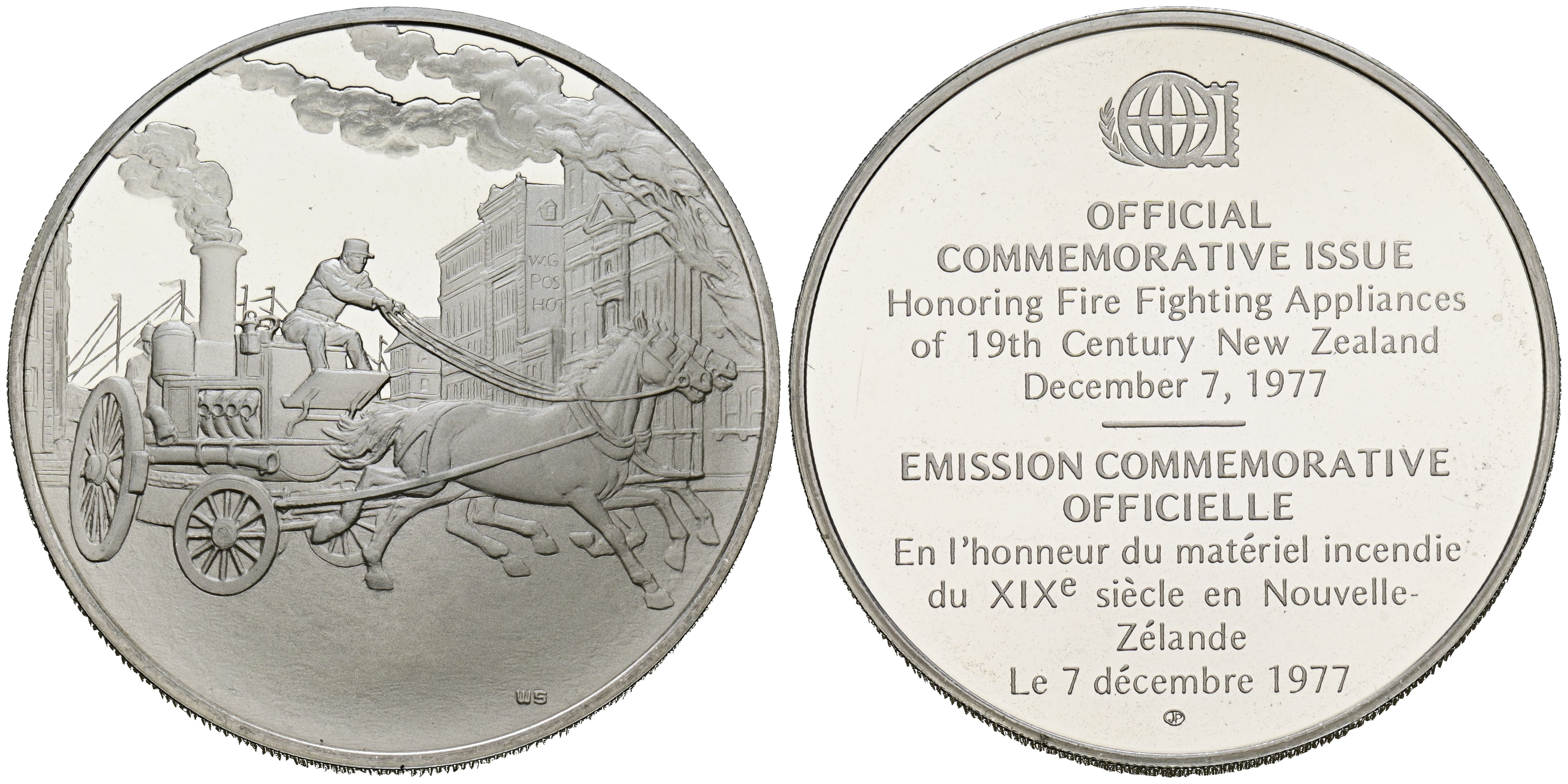 NUEVA ZELANDA. Homenaje a los aparatos contra incendios del siglo XIX (Ar. 19,69g/39mm). 1977. PROOF.