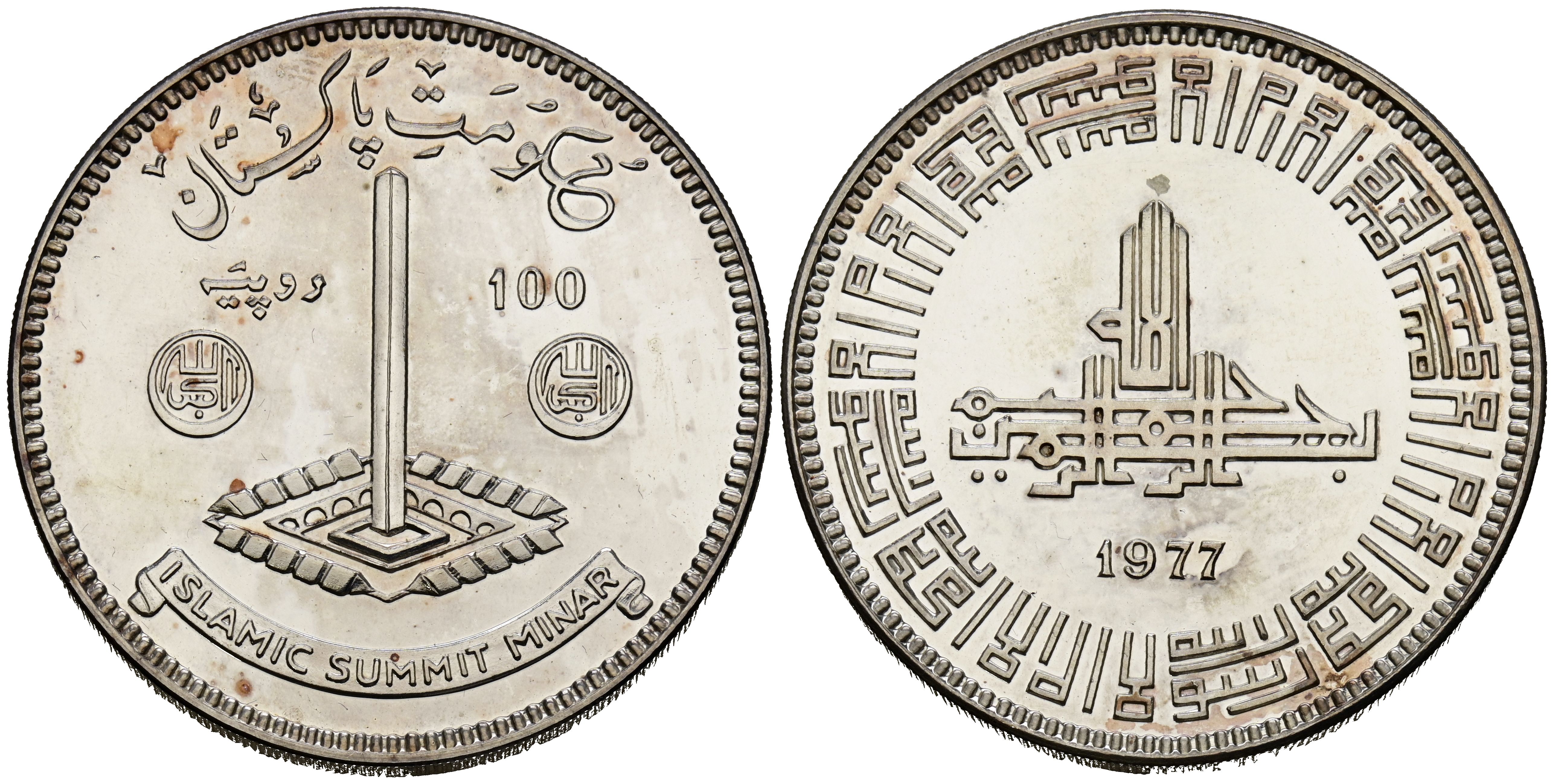 PAKISTÁN. 100 Rupias. (Ar. 20,56g/36mm). 1977. Conferencia Cumbre Islámica. (Km#47). SC. Levísimas marquitas. Muy escasa. Tirada de sólo 1500 unidades.