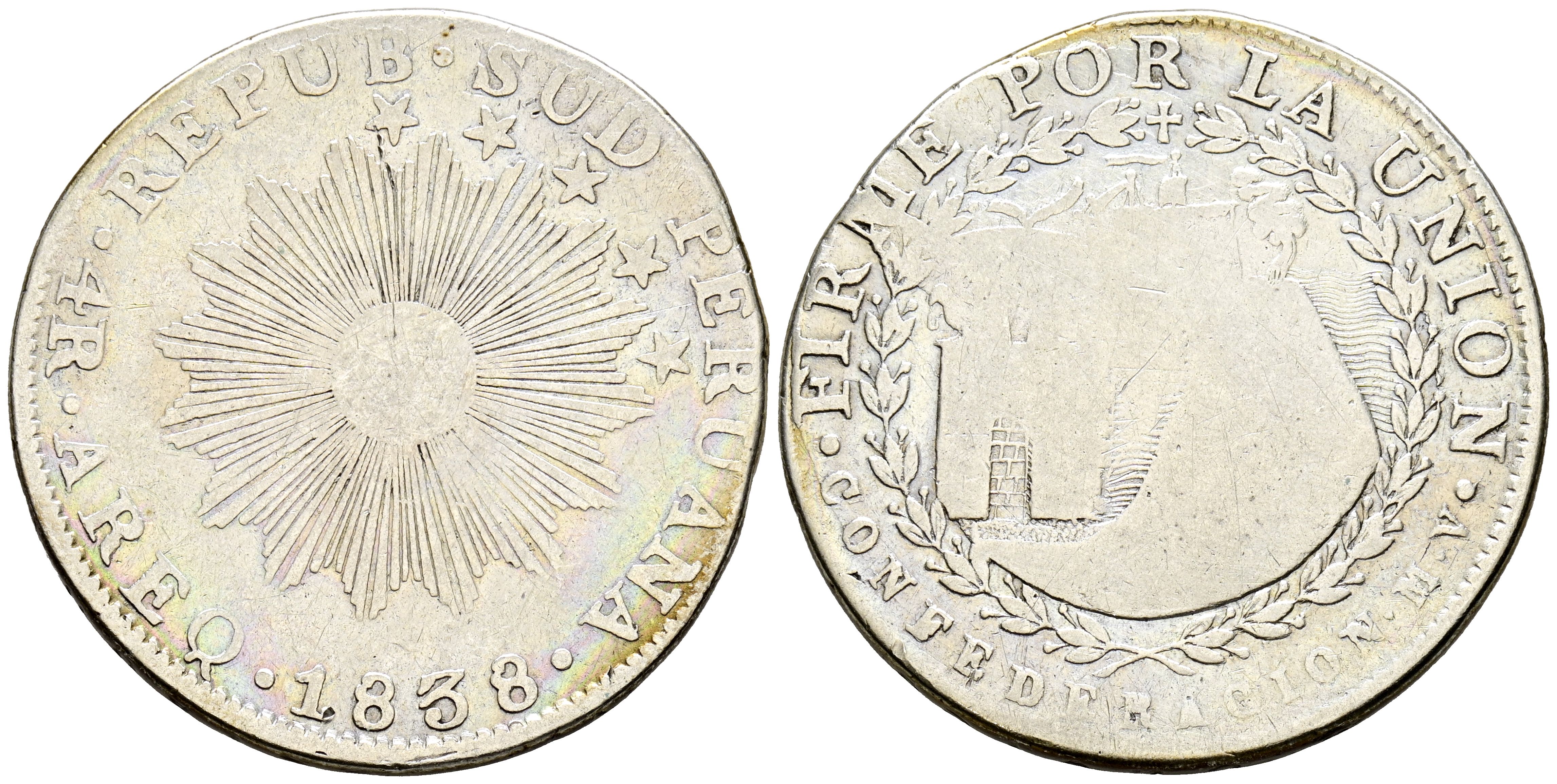 PERÚ. 4 Reales. (Ar. 13,58g/33mm). 1838. Arequipa MV. (Km#172). MBC-/BC+. Rara.