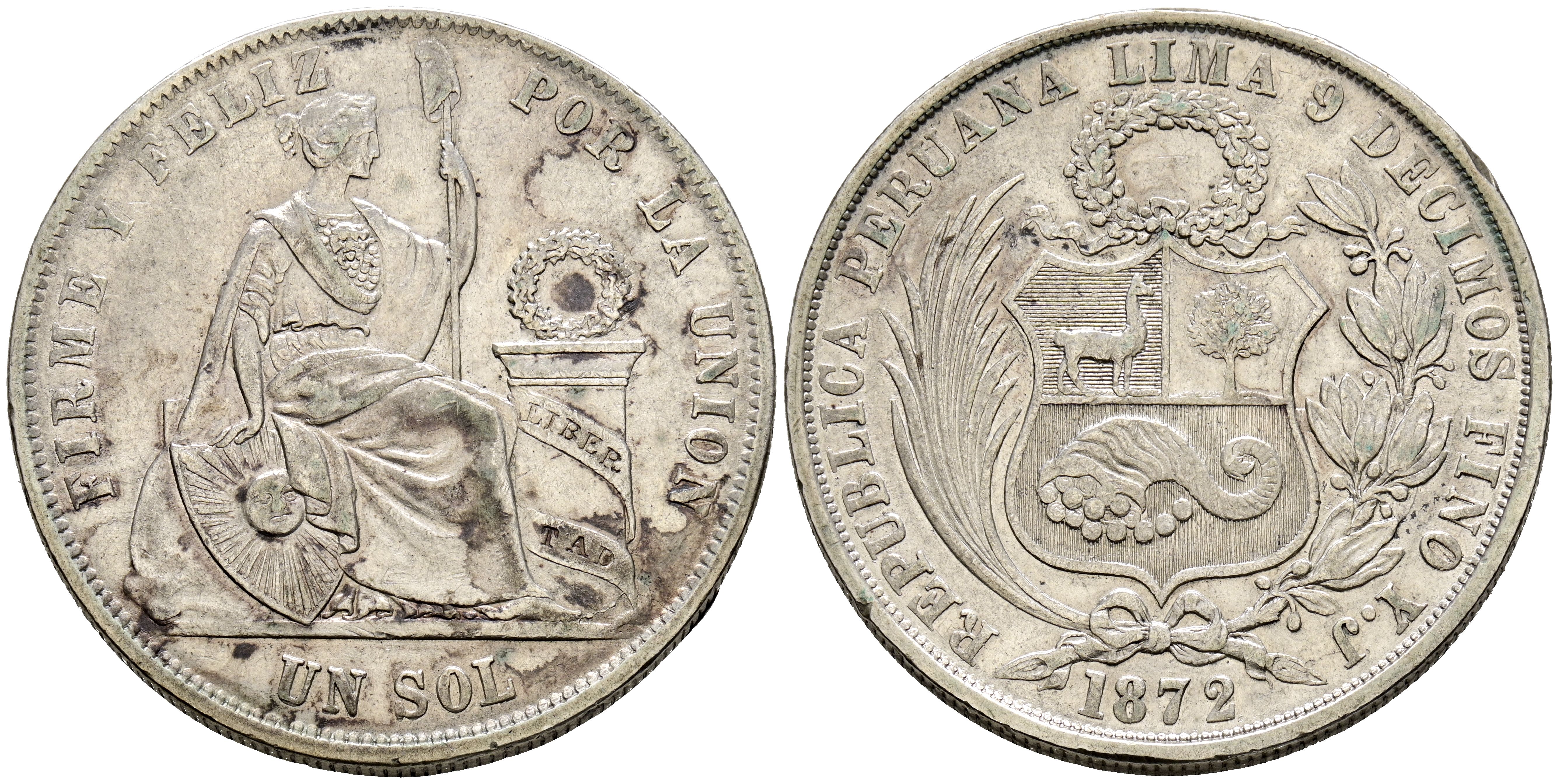 PERÚ. 1 Sol. (Ar. 24,80g/38mm). 1872. Lima YJ. (Km#196). MBC+.