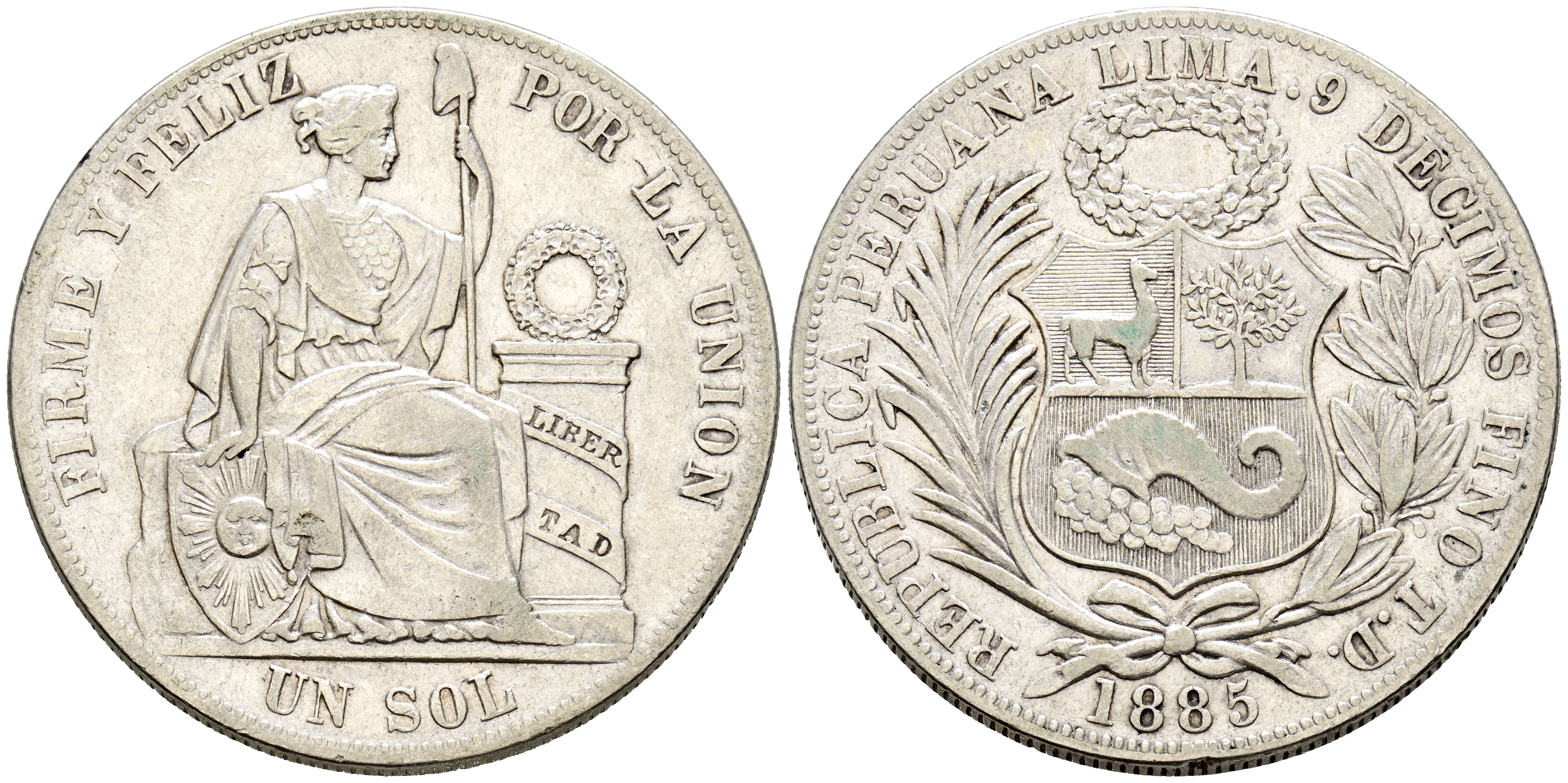 PERÚ. 1 Sol. (Ar. 24,79g/38mm). 1885. Lima TD. (Km#196). MBC. Limpiada.