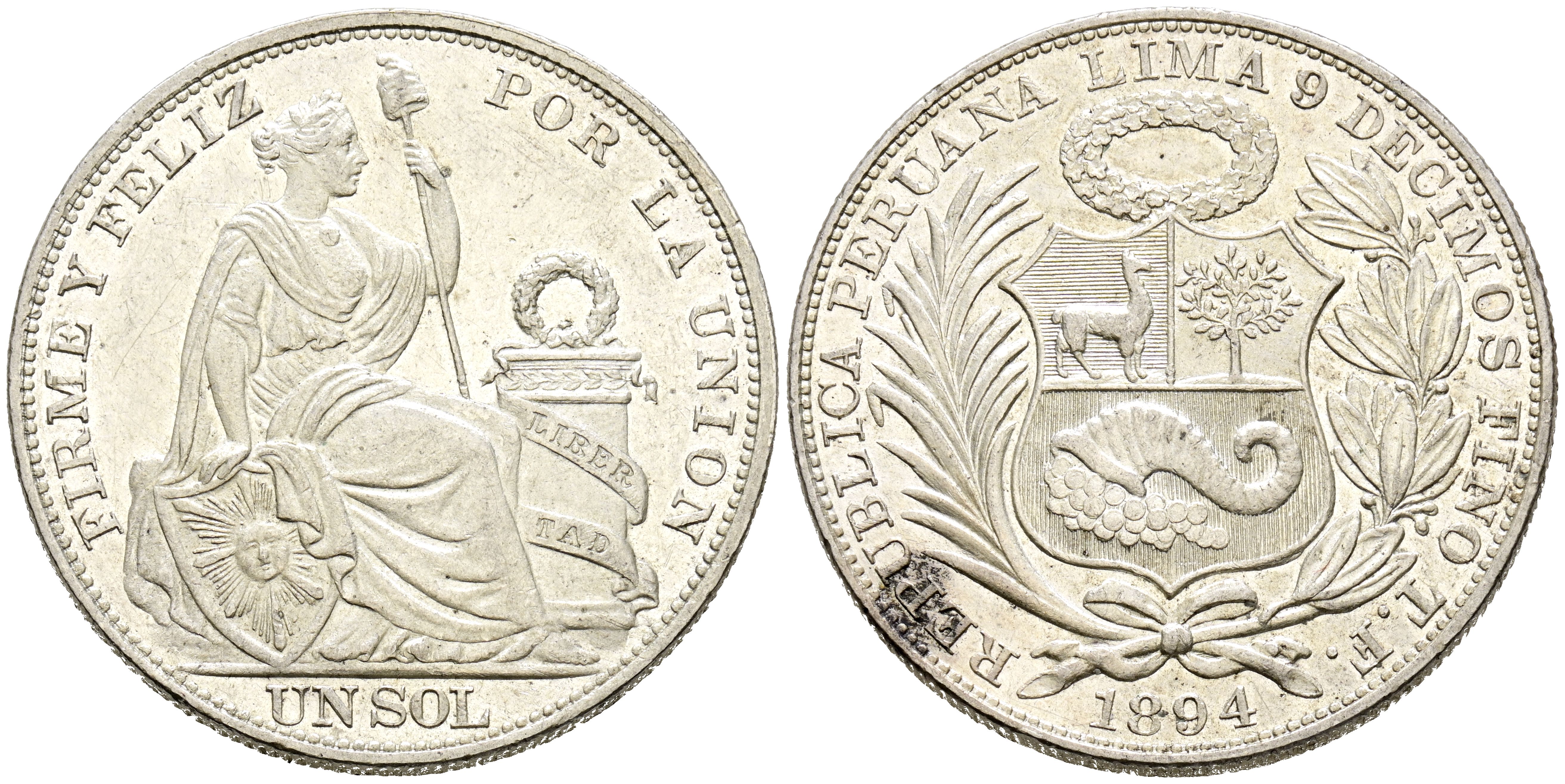 PERÚ. 1 Sol. (Ar. 25,03g/38mm). 1894. Lima TF. (Km#196). EBC. Brillo original. Muy bonito ejemplar.
