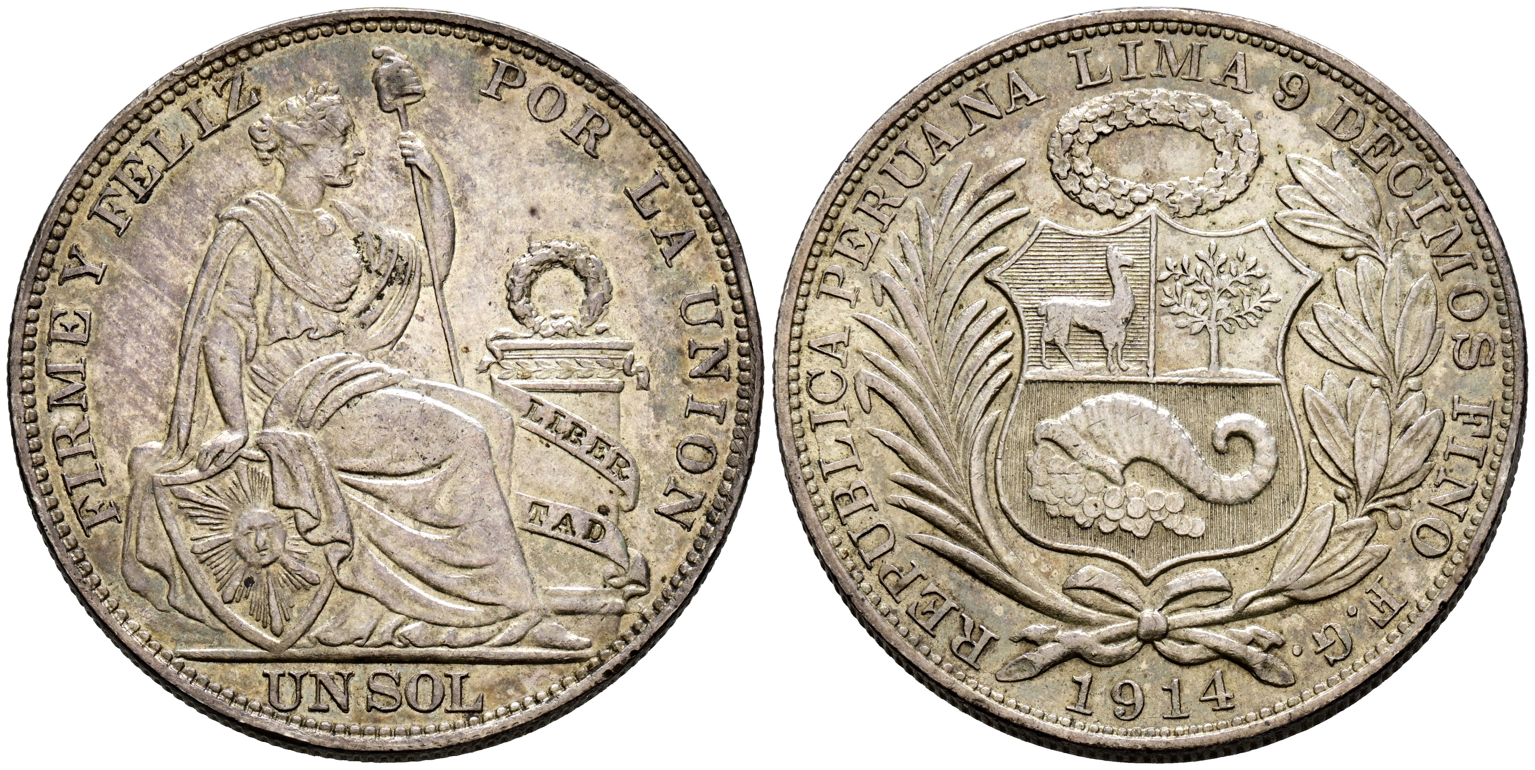 PERÚ. 1 Sol. (Ar. 24,99g/38mm). 1914. Lima FG. (Km#203). EBC. Preciosa pátina. Muy bonito ejemplar.