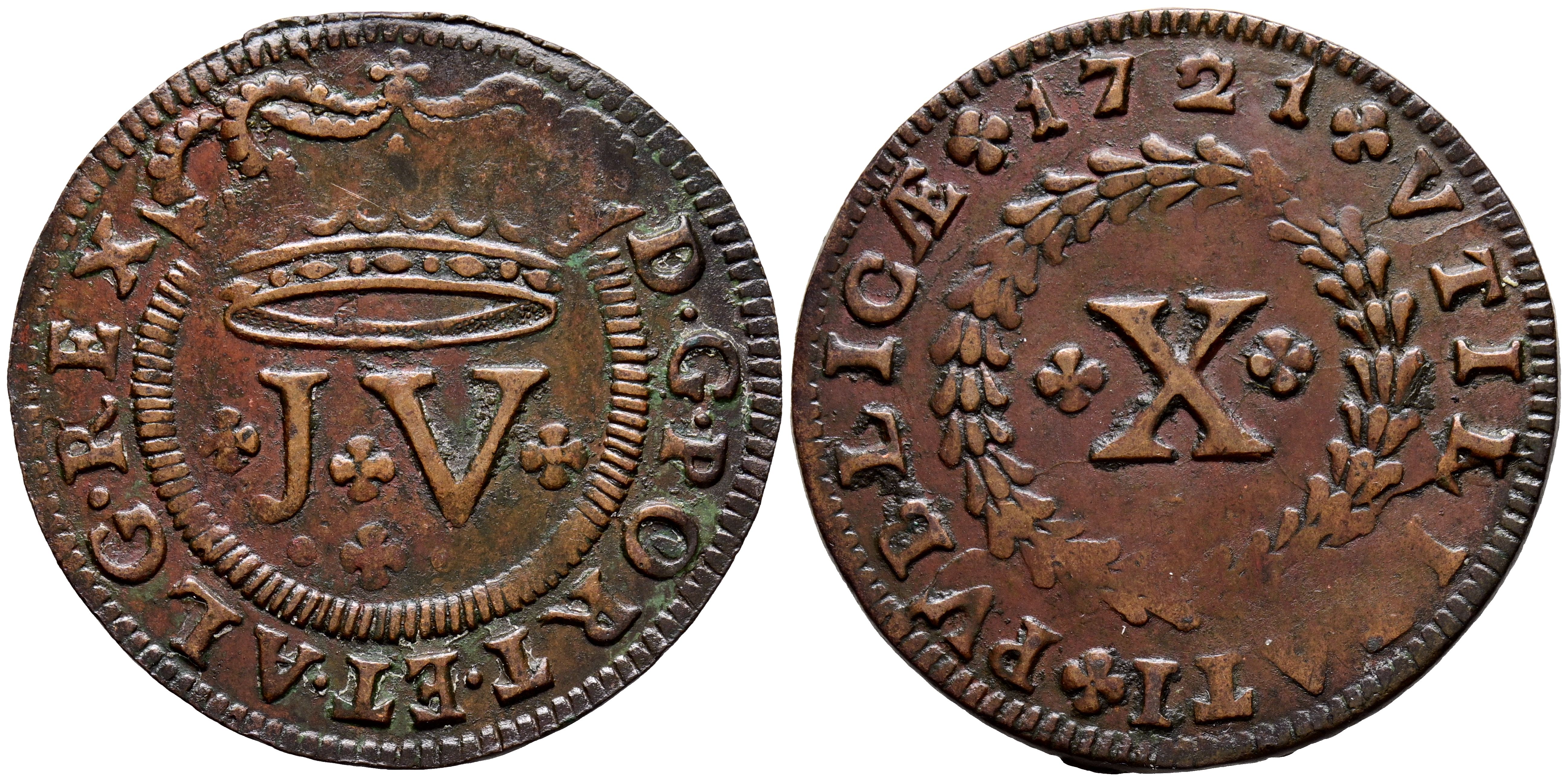 PORTUGAL, Joao V. X Reis. (Ae. 9,54g/37mm). 1721. (Gomes 22.09). MBC. Precioso tono.