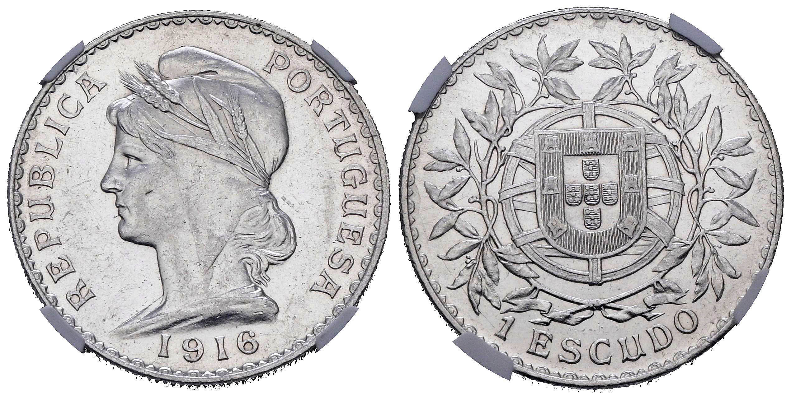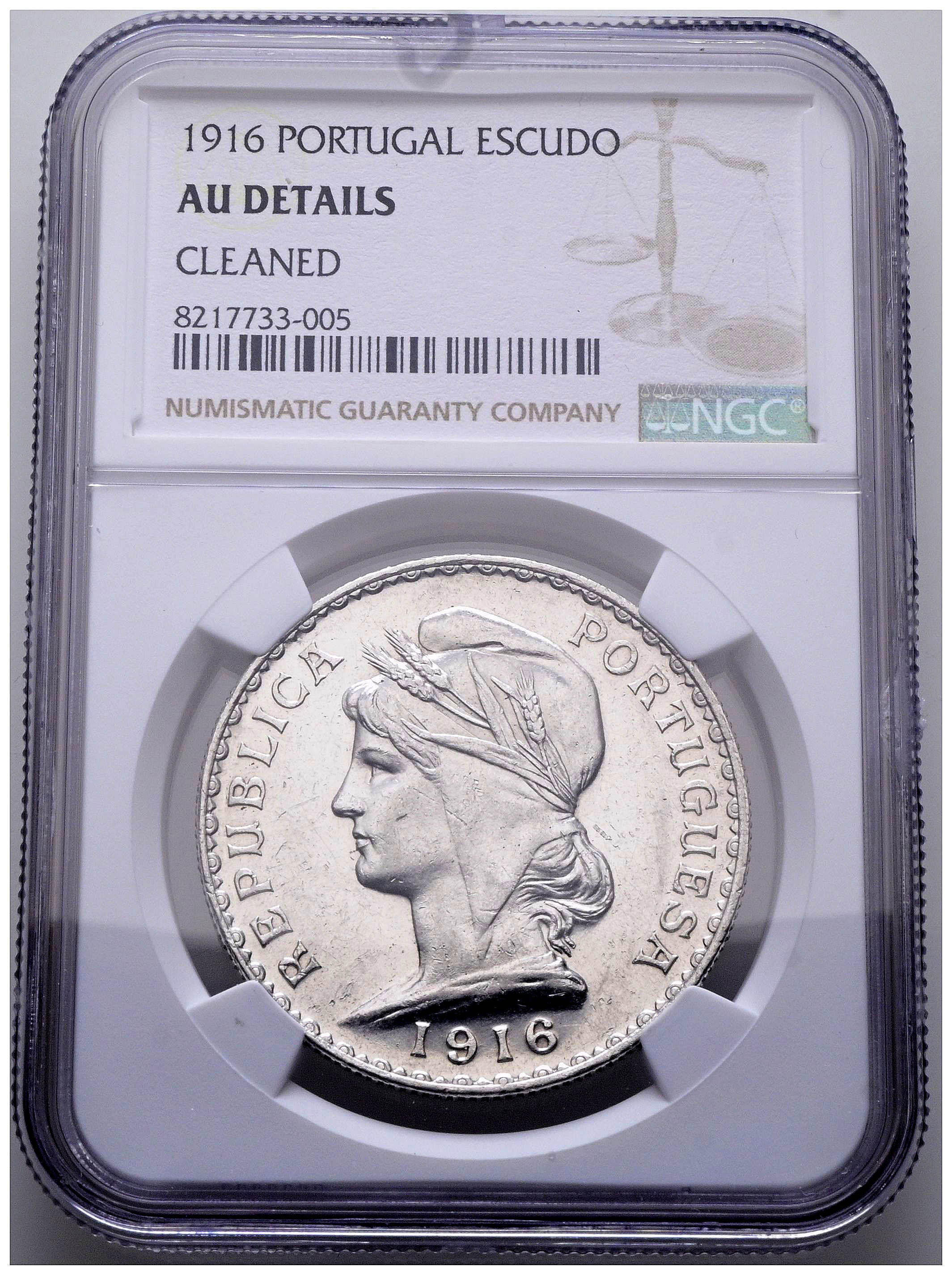 PORTUGAL. 1 Escudo. (Ar. 25,00g/37mm)*. 1916. (Gomes 23.02). Encapsulada por NGC AU Details. Peso y medida teóricos.