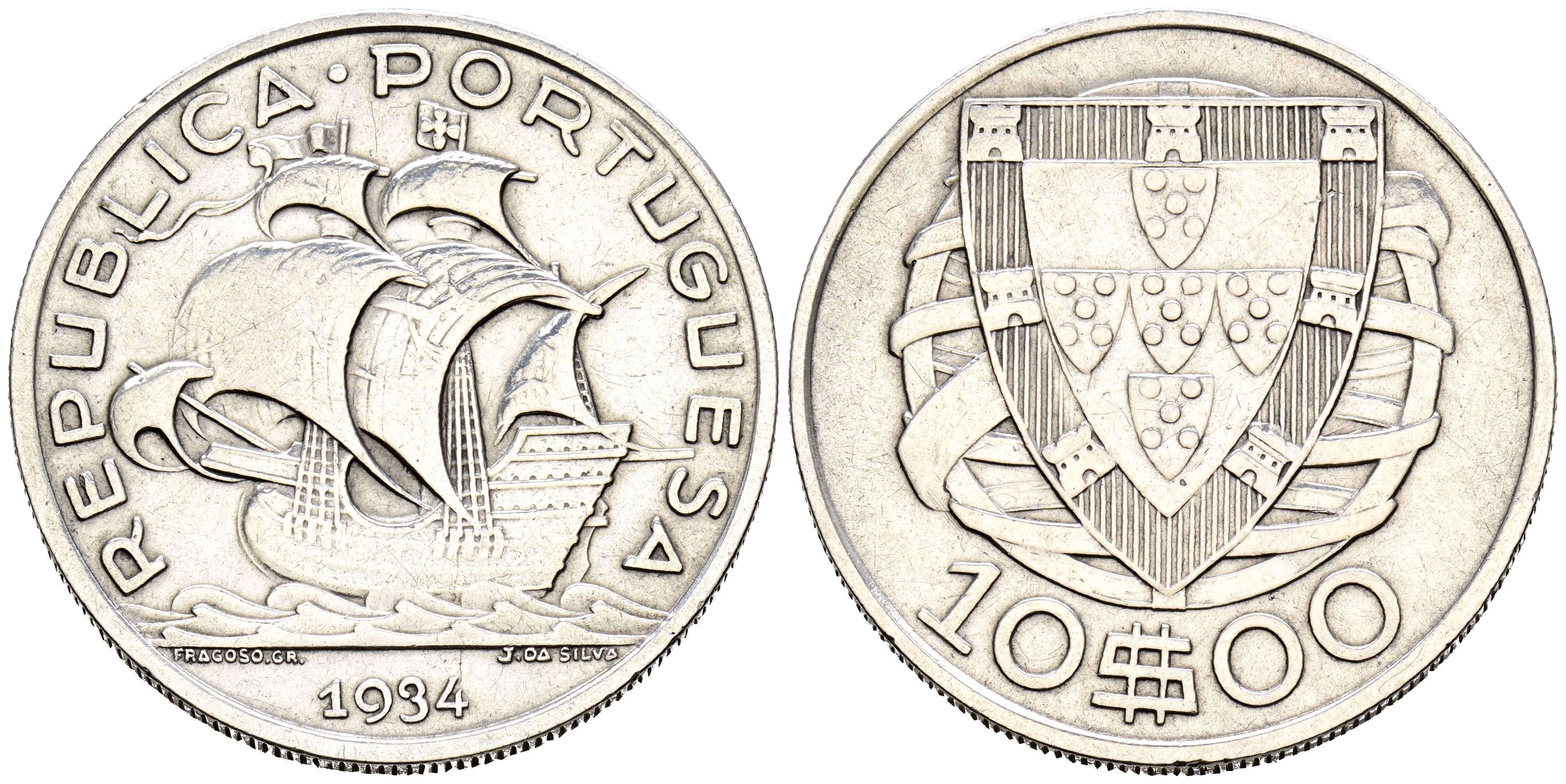 PORTUGAL. 10 Escudos. (Ar. 12,38g/30mm). 1934. (Km#582). MBC+. Limpiada. Escasa.