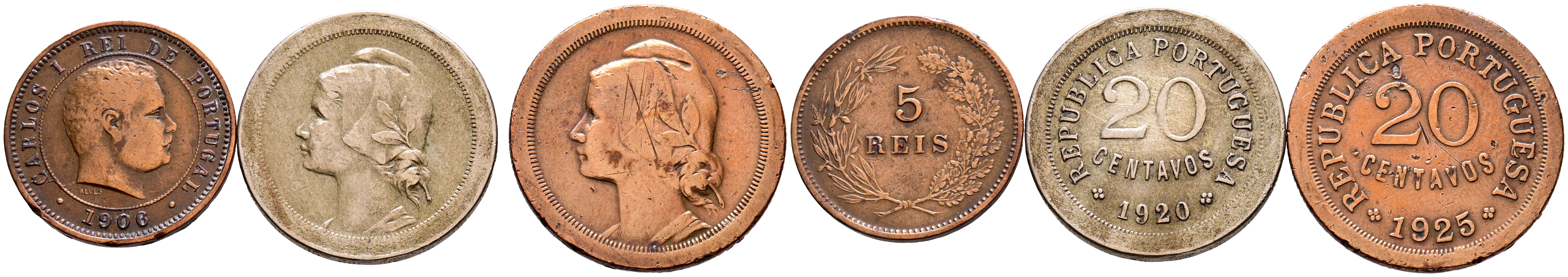 PORTUGAL. Interesante conjunto de 3 monedas acuñadas bajo el reinado de Carlos I y la República Portuguesa. Valores de 5 Reis (1906) y 20 Centavos (1920 y 1925). Lisboa. (Gomes 01.13 y Gomes 13.01 y 15.02) Direntes calidades, modulos y pesos. A EXAMINAR.